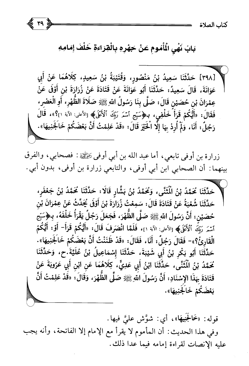 [٣٩٨] حَدَّثَنَا سَعِيدُ بْنُ مَنْصُورٍ، وَقُتَيْبَةُ بْنُ سَعِيدٍ، كِلَاهُمَا عَنْ أَبِي عَوَانَةَ، قَالَ سَعِيدٌ: حَدَّثَنَا أَبُو عَوَانَةَ عَنْ قَتَادَةَ عَنْ زُرَارَةَ بْنِ أَوْفَى عَنْ عِمْرَانَ بْنِ حُصَيْنٍ قَالَ: صَلَّى بِنَا رَسُولُ اللَّهِ صلى الله عليه وسلم صَلَاةَ الظُّهْرِ، أَوِ الْعَصْرِ، فَقَالَ: ((أَيُّكُمْ قَرَأَ خَلْفِي، بـ {سَبِّحِ اسْمَ رَبِّكَ الأَعْلَى}؟ ))، قَالَ رَجُلٌ: أَنَا، وَلَمْ أُرِدْ بِهَا إِلَّا الْخَيْرَ قَالَ: ((قَدْ عَلِمْتُ أَنَّ بَعْضَكُمْ خَالَجَنِيهَا)).