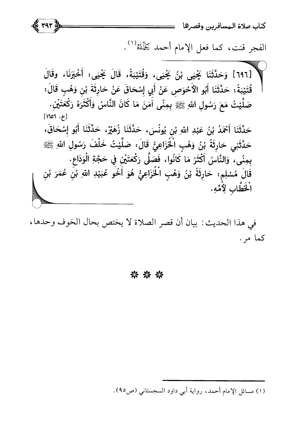 [٦٩٦] وَحَدَّثَنَا يَحْيَى بْنُ يَحْيَى، وَقُتَيْبَةُ، قَالَ يَحْيَى: أَخْبَرَنَا، وقَالَ قُتَيْبَةُ: حَدَّثَنَا أَبُو الأَحْوَصِ عَنْ أَبِي إِسْحَاقَ عَنْ حَارِثَةَ بْنِ وَهْبٍ قَالَ: صَلَّيْتُ مَعَ رَسُولِ اللَّهِ صلى الله عليه وسلم بِمِنًى آمَنَ مَا كَانَ النَّاسُ وَأَكْثَرَهُ رَكْعَتَيْنِ.