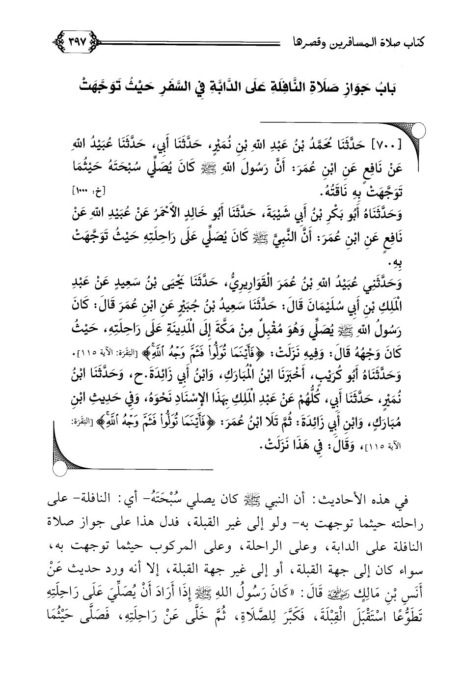 [٧٠٠] حَدَّثَنَا مُحَمَّدُ بْنُ عَبْدِ اللَّهِ بْنِ نُمَيْرٍ، حَدَّثَنَا أَبِي، حَدَّثَنَا عُبَيْدُ اللَّهِ عَنْ نَافِعٍ عَنِ ابْنِ عُمَرَ: أَنّ رَسُولَ اللَّهِ صلى الله عليه وسلم كَانَ يُصَلِّي سُبْحَتَهُ حَيْثُمَا تَوَجَّهَتْ بِهِ نَاقَتُهُ.