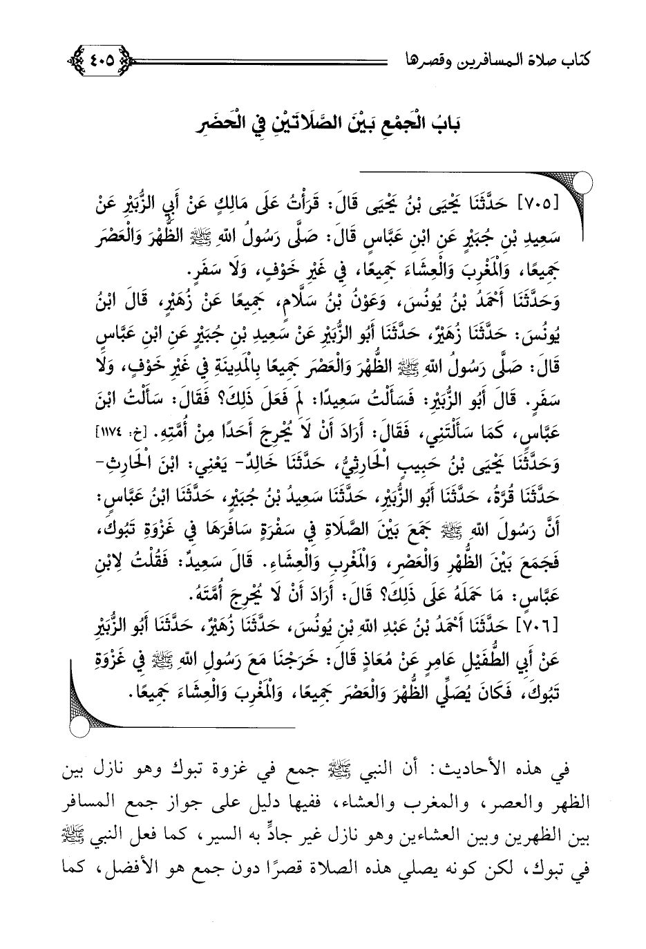 [٧٠٦] حَدَّثَنَا أَحْمَدُ بْنُ عَبْدِ اللَّهِ بْنِ يُونُسَ، حَدَّثَنَا زُهَيْرٌ، حَدَّثَنَا أَبُو الزُّبَيْرِ عَنْ أَبِي الطُّفَيْلِ عَامِرٍ عَنْ مُعَاذٍ قَالَ: خَرَجْنَا مَعَ رَسُولِ اللَّهِ صلى الله عليه وسلم فِي غَزْوَةِ تَبُوكَ، فَكَانَ يُصَلِّي الظُّهْرَ وَالْعَصْرَ جَمِيعًا، وَالْمَغْرِبَ وَالْعِشَاءَ جَمِيعًا.