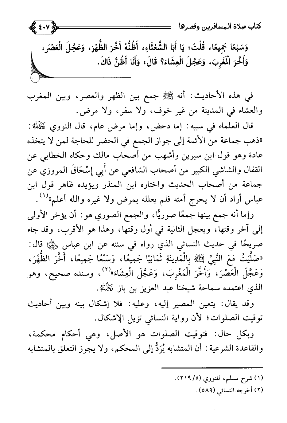 وإما أنه جمع بينها جمعًا صوريًّا، والجمع الصوري هو: أن يؤخر الأولى إلى آخر وقتها، ويعجل الثانية في أول وقتها، وهذا هو الأقرب، وقد جاء صريحًا في حديث النسائي الذي رواه في سننه عن ابن عباس رضي الله عنهما قال: ((صَلَّيْتُ مَعَ النَّبِيِّ صلى الله عليه وسلم بِالْمَدِينَةِ ثَمَانِيًا جَمِيعًا، وَسَبْعًا جَمِيعًا، أَخَّرَ الظُّهْرَ، وَعَجَّلَ الْعَصْرَ، وَأَخَّرَ الْمَغْرِبَ، وَعَجَّلَ الْعِشَاءَ)) (¬٢)، وسنده صحيح، وهو الذي اعتمده سماحة شيخنا عبد العزيز بن باز رحمه الله.
