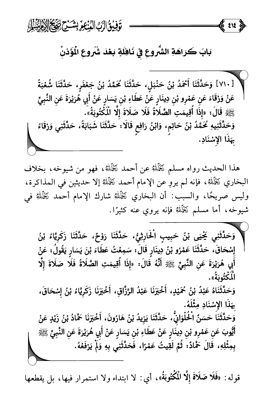 [٧١٠] وَحَدَّثَنَا أَحْمَدُ بْنُ حَنْبَلٍ، حَدَّثَنَا مُحَمَّدُ بْنُ جَعْفَرٍ، حَدَّثَنَا شُعْبَةُ عَنْ وَرْقَاءَ عَنِ عَمْرِو بْنِ دِينَارٍ عَنْ عَطَاءِ بْنِ يَسَارٍ عَنْ أَبِي هُرَيْرَةَ عَنِ النَّبِيِّ صلى الله عليه وسلم قَالَ: ((إِذَا أُقِيمَتِ الصَّلَاةُ فَلَا صَلَاةَ إِلَّا الْمَكْتُوبَةُ)).