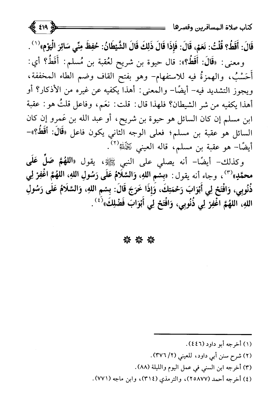 ومعنى: ((قَالَ: أَقَطُ؟ )): قال حيوة بن شريح لعُقبة بن مُسلم: أَقَطُ؟ أي: أَحَسْبُ، والهمزةُ فيه للاستفهام- وهو بفتح القاف وضم الطاء المخففة، ويجوز التشديد فيه- أيضًا- والمعنى: أهذا يكفيه عن غيره من الأذكار؟ أو أهذا يكفيه من شر الشيطان؟ فلهذا قال: قلت: نعَم، وفاعل قلتُ هو: عقبة بن مسلم إن كان السائل هو حيوة بن شريح، أو عبد الله بن عَمرو إن كان السائل هو عقبة بن مسلم؛ فعلى الوجه الثاني يكون فاعل ((قَالَ: أقَطُ؟ )) - أيضًا- هو عقبة بن مسلم، قاله العيني رحمه الله (¬٢).