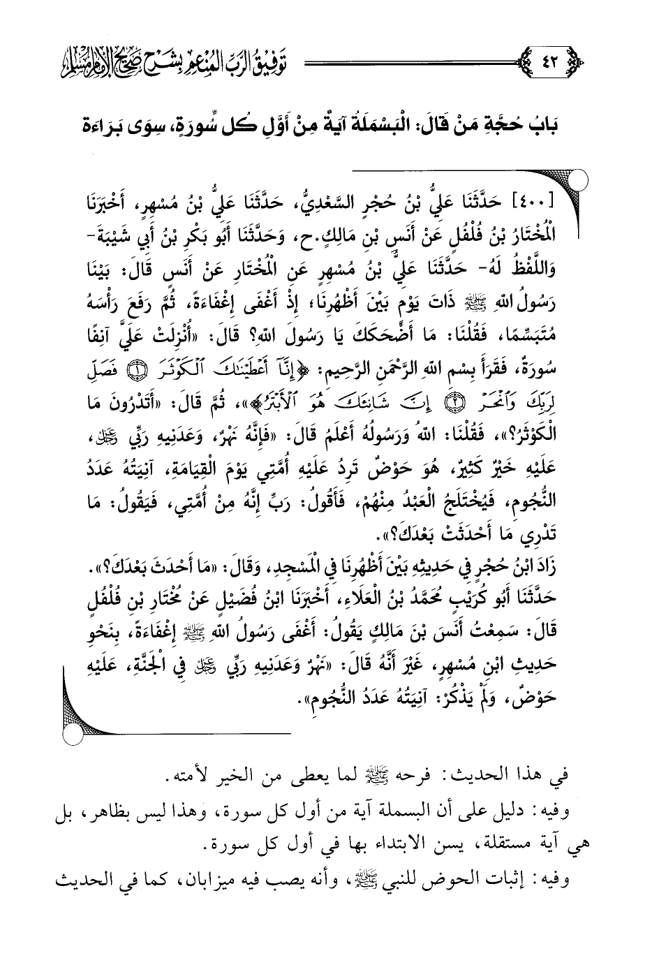 [٤٠٠] حَدَّثَنَا عَلِيُّ بْنُ حُجْرٍ السَّعْدِيُّ، حَدَّثَنَا عَلِيُّ بْنُ مُسْهِرٍ، أَخْبَرَنَا الْمُخْتَارُ بْنُ فُلْفُلٍ عَنْ أَنَسِ بْنِ مَالِكٍ. ح، وَحَدَّثَنَا أَبُو بَكْرِ بْنُ أَبِي شَيْبَةَ- وَاللَّفْظُ لَهُ- حَدَّثَنَا عَلِيُّ بْنُ مُسْهِرٍ عَنِ الْمُخْتَارِ عَنْ أَنَسٍ قَالَ: بَيْنَا رَسُولُ اللَّهِ صلى الله عليه وسلم ذَاتَ يَوْمٍ بَيْنَ أَظْهُرِنَا، إِذْ أَغْفَى إِغْفَاءَةً، ثُمَّ رَفَعَ رَأْسَهُ مُتَبَسِّمًا، فَقُلْنَا: مَا أَضْحَكَكَ يَا رَسُولَ اللَّهِ؟ قَالَ: ((أُنْزِلَتْ عَلَيَّ آنِفًا سُورَةٌ، فَقَرَأَ بِسْمِ اللَّهِ الرَّحْمَنِ الرَّحِيمِ: {إِنَّا أَعْطَيْنَاكَ الْكَوْثَرَ فَصَلِّ لِرَبِّكَ وَانْحَرْ إِنَّ شَانِئَكَ هُوَ الأَبْتَرُ}))، ثُمَّ قَالَ: ((أَتَدْرُونَ مَا الْكَوْثَرُ؟ ))، فَقُلْنَا: اللَّهُ وَرَسُولُهُ أَعْلَمُ قَالَ: ((فَإِنَّهُ نَهْرٌ، وَعَدَنِيهِ رَبِّي عز وجل، عَلَيْهِ خَيْرٌ كَثِيرٌ، هُوَ حَوْضٌ تَرِدُ عَلَيْهِ أُمَّتِي يَوْمَ الْقِيَامَةِ، آنِيَتُهُ عَدَدُ النُّجُومِ، فَيُخْتَلَجُ الْعَبْدُ مِنْهُمْ، فَأَقُولُ: رَبِّ إِنَّهُ مِنْ أُمَّتِي، فَيَقُولُ: مَا تَدْرِي مَا أَحْدَثَتْ بَعْدَكَ؟ )).