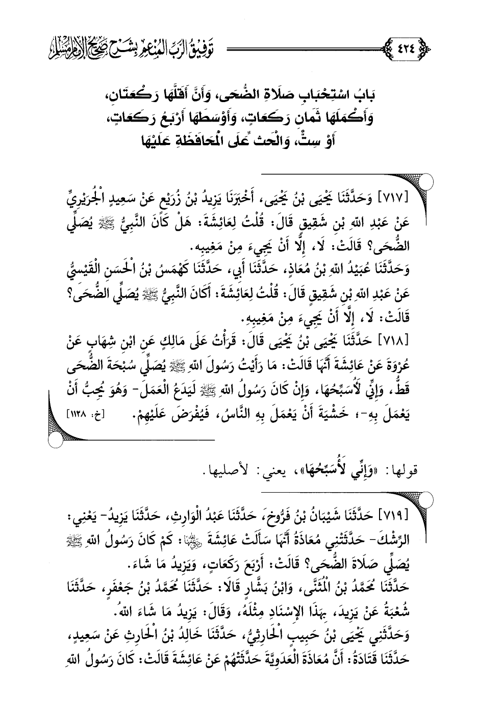[٧١٧] وَحَدَّثَنَا يَحْيَى بْنُ يَحْيَى، أَخْبَرَنَا يَزِيدُ بْنُ زُرَيْعٍ عَنْ سَعِيدٍ الْجُرَيْرِيِّ عَنْ عَبْدِ اللَّهِ بْنِ شَقِيقٍ قَالَ: قُلْتُ لِعَائِشَةَ: هَلْ كَانَ النَّبِيُّ صلى الله عليه وسلم يُصَلِّي الضُّحَى؟ قَالَتْ: لَا، إِلَّا أَنْ يَجِيءَ مِنْ مَغِيبِه.