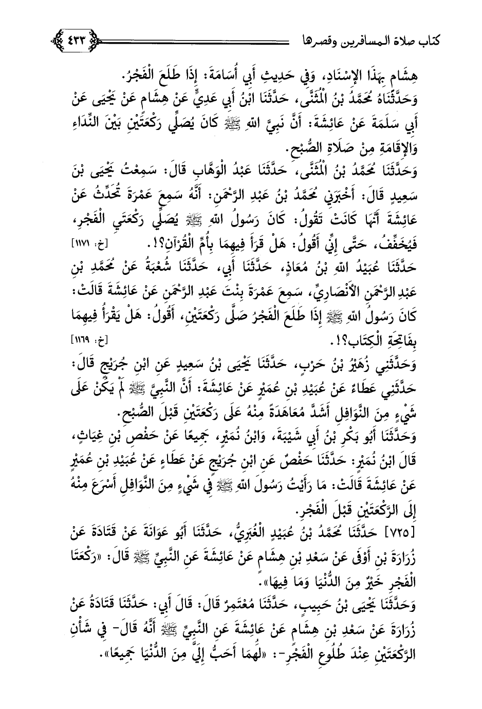 [٧٢٥] حَدَّثَنَا مُحَمَّدُ بْنُ عُبَيْدٍ الْغُبَرِيُّ، حَدَّثَنَا أَبُو عَوَانَةَ عَنْ قَتَادَةَ عَنْ زُرَارَةَ بْنِ أَوْفَى عَنْ سَعْدِ بْنِ هِشَامٍ عَنْ عَائِشَةَ عَنِ النَّبِيِّ صلى الله عليه وسلم قَالَ: ((رَكْعَتَا الْفَجْرِ خَيْرٌ مِنَ الدُّنْيَا وَمَا فِيهَا)).