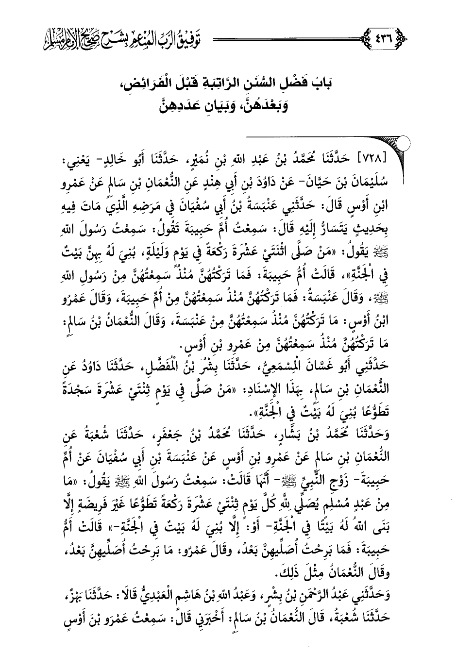 [٧٢٨] حَدَّثَنَا مُحَمَّدُ بْنُ عَبْدِ اللَّهِ بْنِ نُمَيْرٍ، حَدَّثَنَا أَبُو خَالِدٍ- يَعْنِي: سُلَيْمَانَ ابْنَ حَيَّانَ- عَنْ دَاوُدَ بْنِ أَبِي هِنْدٍ عَنِ النُّعْمَانِ بْنِ سَالِمٍ عَنْ عَمْرِو بْنِ أَوْسٍ قَالَ: حَدَّثَنِي عَنْبَسَةُ بْنُ أَبِي سُفْيَانَ فِي مَرَضِهِ الَّذِي مَاتَ فِيهِ بِحَدِيثٍ يَتَسَارُّ إِلَيْهِ قَالَ: سَمِعْتُ أُمَّ حَبِيبَةَ تَقُولُ: سَمِعْتُ رَسُولَ اللَّهِ صلى الله عليه وسلم يَقُولُ: ((مَنْ صَلَّى اثْنَتَيْ عَشْرَةَ رَكْعَةً فِي يَوْمٍ وَلَيْلَةٍ، بُنِيَ لَهُ بِهِنَّ بَيْتٌ فِي الْجَنَّةِ))، قَالَتْ أُمُّ حَبِيبَةَ: فَمَا تَرَكْتُهُنَّ مُنْذُ سَمِعْتُهُنَّ مِنْ رَسُولِ اللَّهِ صلى الله عليه وسلم، وَقَالَ عَنْبَسَةُ: فَمَا تَرَكْتُهُنَّ مُنْذُ سَمِعْتُهُنَّ مِنْ أُمِّ حَبِيبَةَ، وَقَالَ عَمْرُو بْنُ أَوْسٍ: مَا تَرَكْتُهُنَّ مُنْذُ سَمِعْتُهُنَّ مِنْ عَنْبَسَةَ، وَقَالَ النُّعْمَانُ بْنُ سَالِمٍ: مَا تَرَكْتُهُنَّ مُنْذُ سَمِعْتُهُنَّ مِنْ عَمْرِو بْنِ أَوْسٍ.