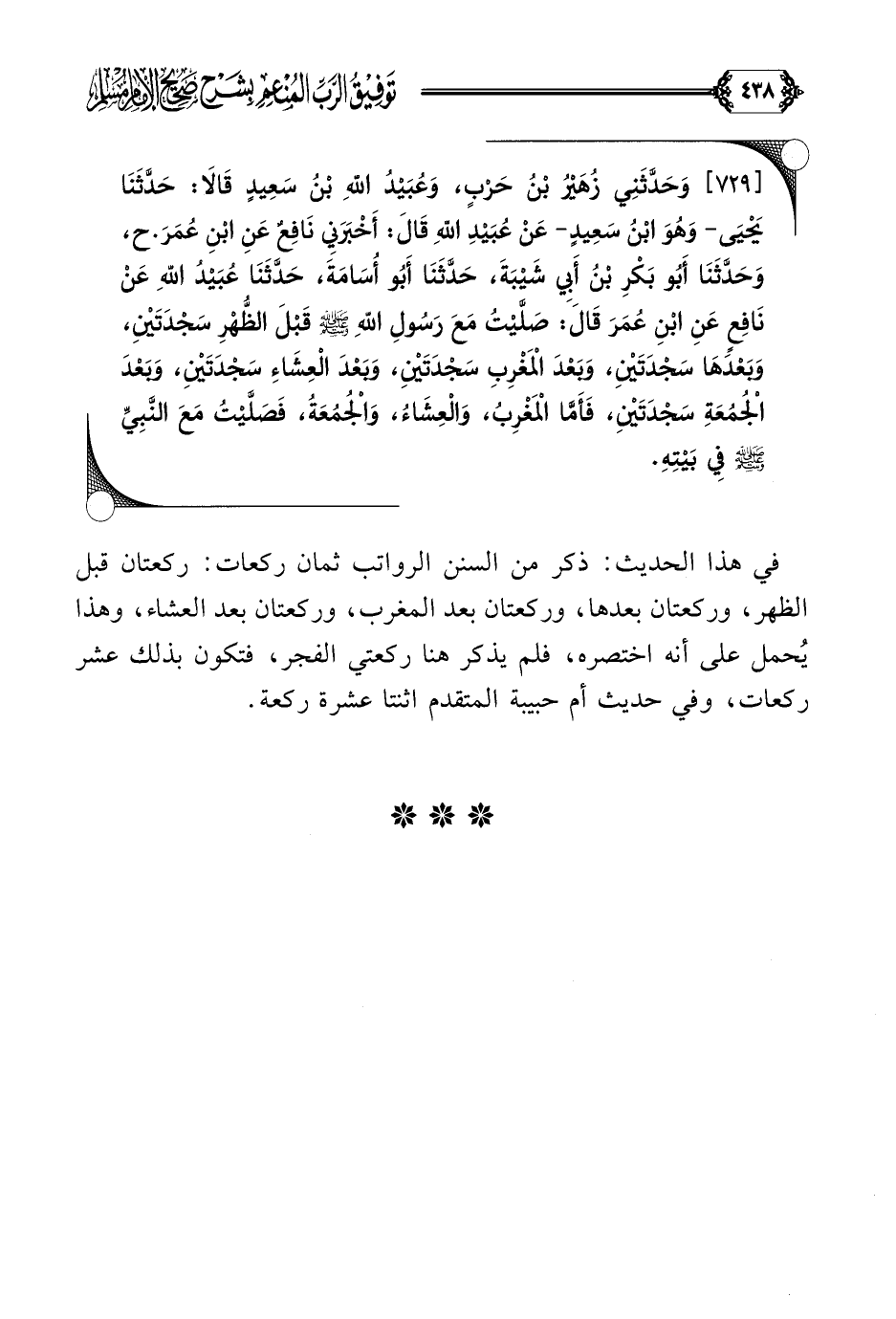 [٧٢٩] وَحَدَّثَنِي زُهَيْرُ بْنُ حَرْبٍ، وَعُبَيْدُ اللَّهِ بْنُ سَعِيدٍ قَالَا: حَدَّثَنَا يَحْيَى- وَهُوَ ابْنُ سَعِيدٍ- عَنْ عُبَيْدِ اللَّهِ قَالَ: أَخْبَرَنِي نَافِعٌ عَنِ ابْنِ عُمَرَ. ح، وَحَدَّثَنَا أَبُو بَكْرِ بْنُ أَبِي شَيْبَةَ، حَدَّثَنَا أَبُو أُسَامَةَ، حَدَّثَنَا عُبَيْدُ اللَّهِ عَنْ نَافِعٍ عَنِ ابْنِ عُمَرَ قَالَ: صَلَّيْتُ مَعَ رَسُولِ اللَّهِ صلى الله عليه وسلم قَبْلَ الظُّهْرِ سَجْدَتَيْنِ، وَبَعْدَهَا سَجْدَتَيْنِ، وَبَعْدَ الْمَغْرِبِ سَجْدَتَيْنِ، وَبَعْدَ الْعِشَاءِ سَجْدَتَيْنِ، وَبَعْدَ الْجُمُعَةِ سَجْدَتَيْنِ، فَأَمَّا الْمَغْرِبُ، وَالْعِشَاءُ، وَالْجُمُعَةُ، فَصَلَّيْتُ مَعَ النَّبِيِّ صلى الله عليه وسلم فِي بَيْتِهِ.