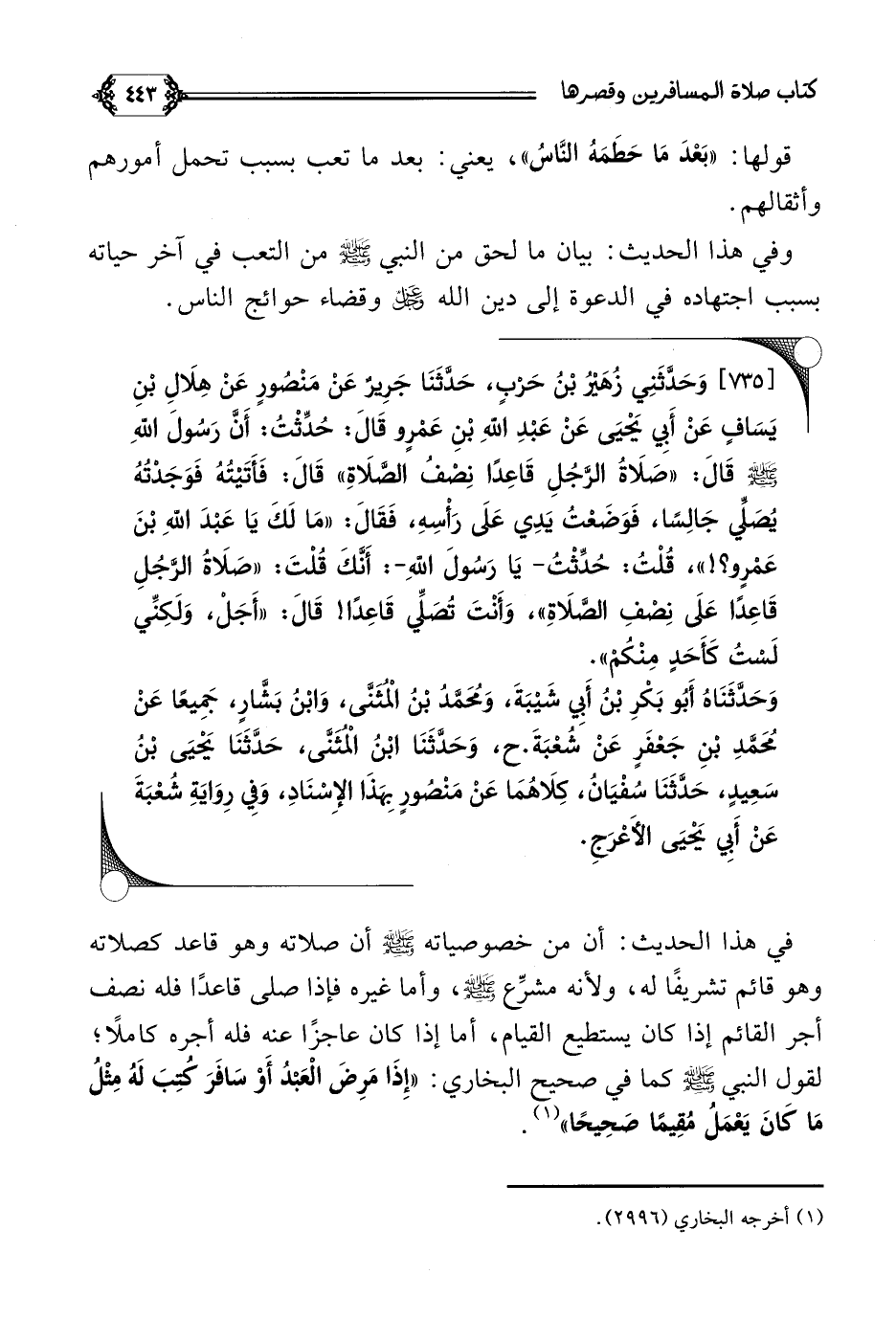 [٧٣٥] وَحَدَّثَنِي زُهَيْرُ بْنُ حَرْبٍ، حَدَّثَنَا جَرِيرٌ عَنْ مَنْصُورٍ عَنْ هِلَالِ بْنِ يَسَافٍ عَنْ أَبِي يَحْيَى عَنْ عَبْدِ اللَّهِ بْنِ عَمْرٍو قَالَ: حُدِّثْتُ: أَنَّ رَسُولَ اللَّهِ صلى الله عليه وسلم قَالَ: ((صَلَاةُ الرَّجُلِ قَاعِدًا نِصْفُ الصَّلَاةِ)) قَالَ: فَأَتَيْتُهُ فَوَجَدْتُهُ يُصَلِّي جَالِسًا، فَوَضَعْتُ يَدِي عَلَى رَأْسِهِ، فَقَالَ: ((مَا لَكَ يَا عَبْدَ اللَّهِ بْنَ عَمْرٍو؟ ! ))، قُلْتُ: حُدِّثْتُ- يَا رَسُولَ اللَّهِ-: أَنَّكَ قُلْتَ: ((صَلَاةُ الرَّجُلِ قَاعِدًا عَلَى نِصْفِ الصَّلَاةِ))، وَأَنْتَ تُصَلِّي قَاعِدًا! قَالَ: ((أَجَلْ، وَلَكِنِّي لَسْتُ كَأَحَدٍ مِنْكُمْ)).
