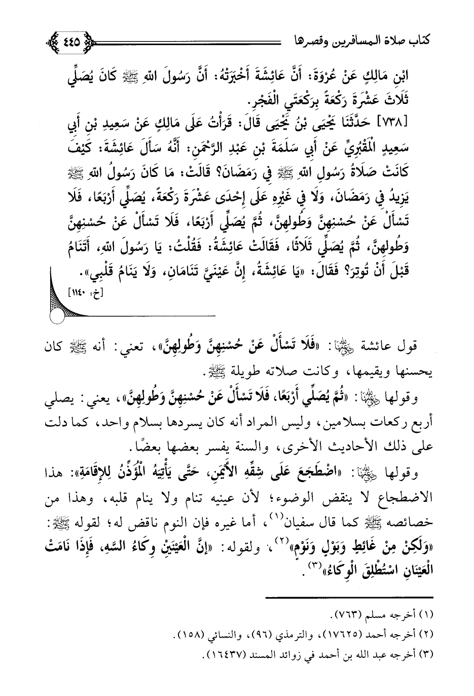 [٧٣٨] حَدَّثَنَا يَحْيَى بْنُ يَحْيَى قَالَ: قَرَأْتُ عَلَى مَالِكٍ عَنْ سَعِيدِ بْنِ أَبِي سَعِيدٍ الْمَقْبُرِيِّ عَنْ أَبِي سَلَمَةَ بْنِ عَبْدِ الرَّحْمَنِ: أَنَّهُ سَأَلَ عَائِشَةَ: كَيْفَ كَانَتْ صَلَاةُ رَسُولِ اللَّهِ صلى الله عليه وسلم فِي رَمَضَانَ؟ قَالَتْ: مَا كَانَ رَسُولُ اللَّهِ صلى الله عليه وسلم يَزِيدُ فِي رَمَضَانَ، وَلَا فِي غَيْرِهِ عَلَى إِحْدَى عَشْرَةَ رَكْعَةً، يُصَلِّي أَرْبَعًا، فَلَا تَسْأَلْ عَنْ حُسْنِهِنَّ وَطُولِهِنَّ، ثُمَّ يُصَلِّي أَرْبَعًا، فَلَا تَسْأَلْ عَنْ حُسْنِهِنَّ وَطُولِهِنَّ، ثُمَّ يُصَلِّي ثَلَاثًا، فَقَالَتْ عَائِشَةُ: فَقُلْتُ: يَا رَسُولَ اللَّهِ، أَتَنَامُ قَبْلَ أَنْ تُوتِرَ؟ فَقَالَ: ((يَا عَائِشَةُ، إِنَّ عَيْنَيَّ تَنَامَانِ، وَلَا يَنَامُ قَلْبِي)).