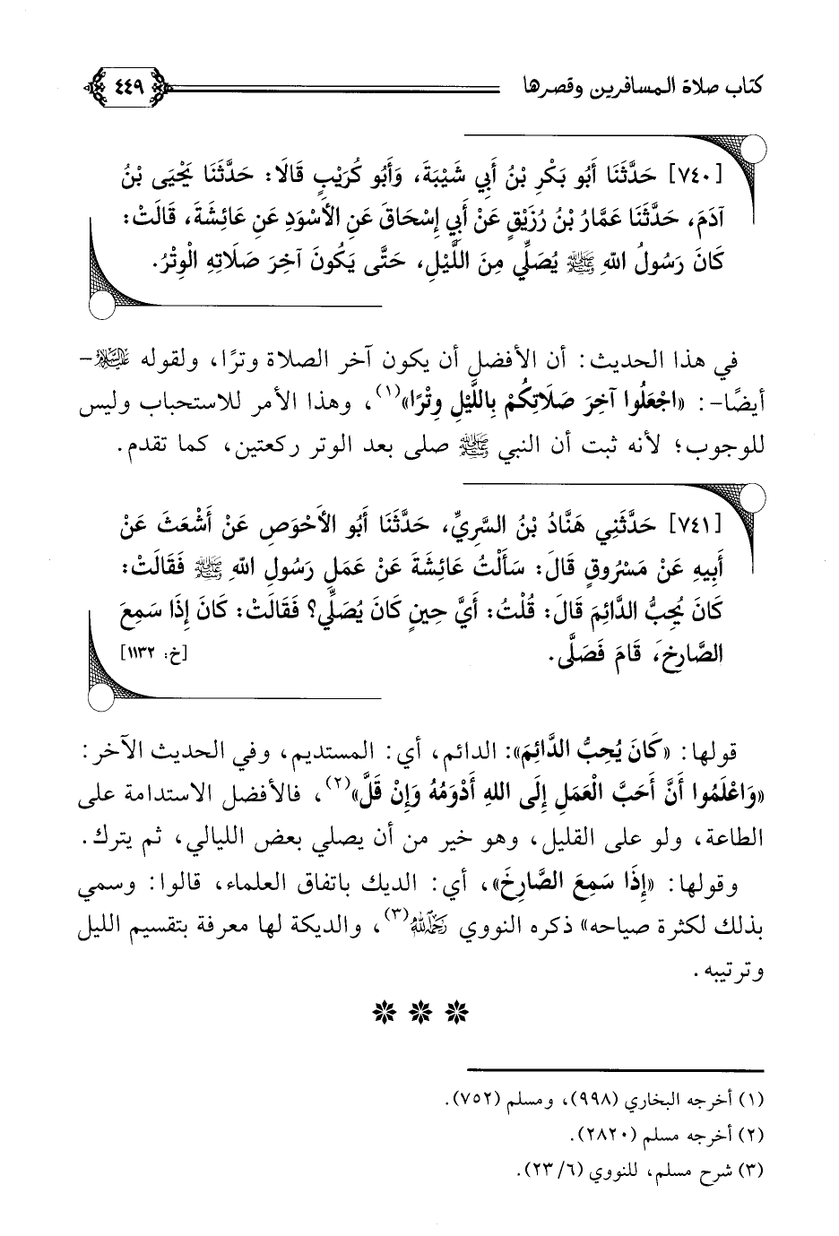 [٧٤١] حَدَّثَنِي هَنَّادُ بْنُ السَّرِيِّ، حَدَّثَنَا أَبُو الأَحْوَصِ عَنْ أَشْعَثَ عَنْ أَبِيهِ عَنْ مَسْرُوقٍ قَالَ: سَأَلْتُ عَائِشَةَ عَنْ عَمَلِ رَسُولِ اللَّهِ صلى الله عليه وسلم فَقَالَتْ: كَانَ يُحِبُّ الدَّائِمَ قَالَ: قُلْتُ: أَيَّ حِينٍ كَانَ يُصَلِّي؟ فَقَالَتْ: كَانَ إِذَا سَمِعَ الصَّارِخَ، قَامَ فَصَلَّى.