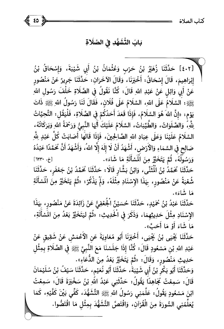 [٤٠٢] حَدَّثَنَا زُهَيْرُ بْنُ حَرْبٍ وَعُثْمَانُ بْنُ أَبِي شَيْبَةَ، وَإِسْحَاقُ بْنُ إِبْرَاهِيمَ، قَالَ إِسْحَاقُ: أَخْبَرَنَا، وَقَالَ الآخَرَانِ: حَدَّثَنَا جَرِيرٌ عَنْ مَنْصُورٍ عَنْ أَبِي وَائِلٍ عَنْ عَبْدِ اللَّهِ قَالَ: كُنَّا نَقُولُ فِي الصَّلَاةِ خَلْفَ رَسُولِ اللَّهِ صلى الله عليه وسلم: السَّلَامُ عَلَى اللَّهِ، السَّلَامُ عَلَى فُلَانٍ، فَقَالَ لَنَا رَسُولُ اللَّهِ صلى الله عليه وسلم ذَاتَ يَوْمٍ: ((إِنَّ اللَّهَ هُوَ السَّلَامُ، فَإِذَا قَعَدَ أَحَدُكُمْ فِي الصَّلَاةِ، فَلْيَقُلِ: التَّحِيَّاتُ لِلَّهِ، وَالصَّلَوَاتُ، وَالطَّيِّبَاتُ، السَّلَامُ عَلَيْكَ أَيُّهَا النَّبِيُّ وَرَحْمَةُ اللَّهِ وَبَرَكَاتُهُ، السَّلَامُ عَلَيْنَا وَعَلَى عِبَادِ اللَّهِ الصَّالِحِينَ، فَإِذَا قَالَهَا أَصَابَتْ كُلَّ عَبْدٍ لِلَّهِ صَالِحٍ فِي السَّمَاءِ وَالأَرْضِ، أَشْهَدُ أَنْ لَا إِلَهَ إِلَّا اللَّهُ، وَأَشْهَدُ أَنَّ مُحَمَّدًا عَبْدُهُ وَرَسُولُهُ، ثُمَّ يَتَخَيَّرُ مِنَ الْمَسْأَلَةِ مَا شَاءَ)).