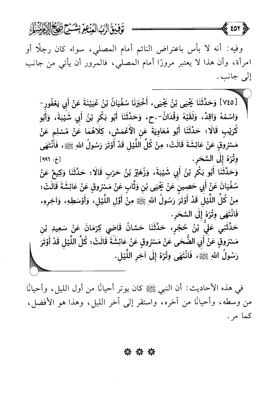 وفيه: أنه لا بأس باعتراض النائم أمام المصلي، سواء كان رجلًا أو امرأة، وأن هذا لا يعتبر مرورًا أمام المصلي، فالمرور أن يأتي من جانب إلى جانب.