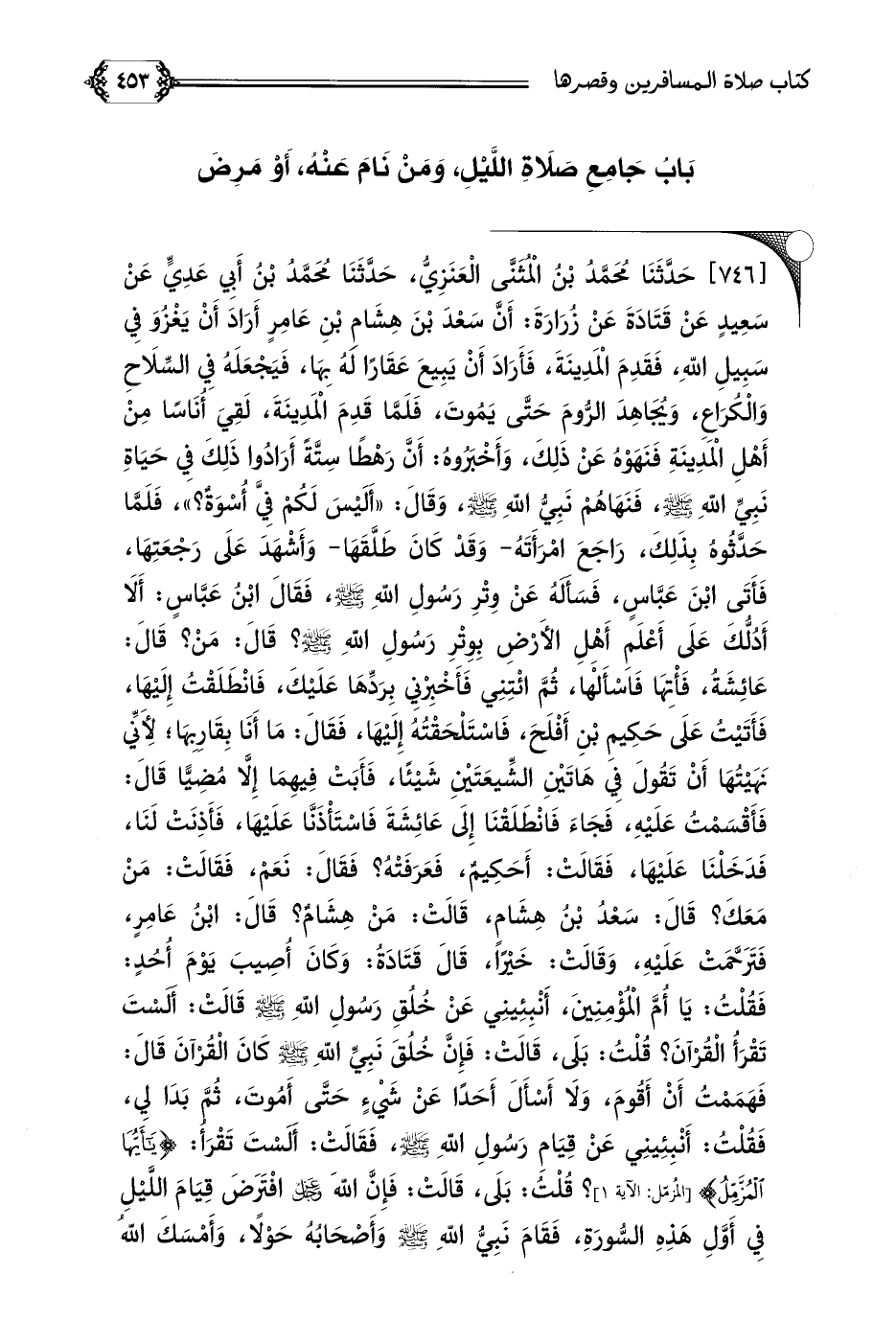 [٧٤٦] حَدَّثَنَا مُحَمَّدُ بْنُ الْمُثَنَّى الْعَنَزِيُّ، حَدَّثَنَا مُحَمَّدُ بْنُ أَبِي عَدِيٍّ عَنْ سَعِيدٍ عَنْ قَتَادَةَ عَنْ زُرَارَةَ: أَنَّ سَعْدَ بْنَ هِشَامِ بْنِ عَامِرٍ أَرَادَ أَنْ يَغْزُوَ فِي سَبِيلِ اللَّهِ، فَقَدِمَ الْمَدِينَةَ، فَأَرَادَ أَنْ يَبِيعَ عَقَارًا لَهُ بِهَا، فَيَجْعَلَهُ فِي السِّلَاحِ وَالْكُرَاعِ، وَيُجَاهِدَ الرُّومَ حَتَّى يَمُوتَ، فَلَمَّا قَدِمَ الْمَدِينَةَ، لَقِيَ أُنَاسًا مِنْ أَهْلِ الْمَدِينَةِ فَنَهَوْهُ عَنْ ذَلِكَ، وَأَخْبَرُوهُ: أَنَّ رَهْطًا سِتَّةً أَرَادُوا ذَلِكَ فِي حَيَاةِ نَبِيِّ اللَّهِ صلى الله عليه وسلم، فَنَهَاهُمْ نَبِيُّ اللَّهِ صلى الله عليه وسلم، وَقَالَ: ((أَلَيْسَ لَكُمْ فِيَّ أُسْوَةٌ؟ ))، فَلَمَّا حَدَّثُوهُ بِذَلِكَ، رَاجَعَ امْرَأَتَهُ- وَقَدْ كَانَ طَلَّقَهَا- وَأَشْهَدَ عَلَى رَجْعَتِهَا، فَأَتَى ابْنَ عَبَّاسٍ، فَسَأَلَهُ عَنْ وِتْرِ رَسُولِ اللَّهِ صلى الله عليه وسلم، فَقَالَ ابْنُ عَبَّاسٍ: أَلَا أَدُلُّكَ عَلَى أَعْلَمِ أَهْلِ الأَرْضِ بِوِتْرِ رَسُولِ اللَّهِ صلى الله عليه وسلم؟ قَالَ: مَنْ؟ قَالَ: عَائِشَةُ، فَأْتِهَا فَاسْأَلْهَا، ثُمَّ ائْتِنِي فَأَخْبِرْنِي بِرَدِّهَا عَلَيْكَ، فَانْطَلَقْتُ إِلَيْهَا، فَأَتَيْتُ عَلَى حَكِيمِ بْنِ أَفْلَحَ، فَاسْتَلْحَقْتُهُ إِلَيْهَا، فَقَالَ: مَا أَنَا بِقَارِبِهَا؛ لِأَنِّي نَهَيْتُهَا أَنْ تَقُولَ فِي هَاتَيْنِ الشِّيعَتَيْنِ شَيْئًا، فَأَبَتْ فِيهِمَا إِلَّا مُضِيًّا قَالَ: فَأَقْسَمْتُ عَلَيْهِ، فَجَاءَ فَانْطَلَقْنَا إِلَى عَائِشَةَ فَاسْتَأْذَنَّا عَلَيْهَا، فَأَذِنَتْ لَنَا، فَدَخَلْنَا عَلَيْهَا، فَقَالَتْ: أَحَكِيمٌ، فَعَرَفَتْهُ؟ فَقَالَ: نَعَمْ، فَقَالَتْ: مَنْ مَعَكَ؟ قَالَ: سَعْدُ بْنُ هِشَامٍ، قَالَتْ: مَنْ هِشَامٌ؟ قَالَ: ابْنُ عَامِرٍ،