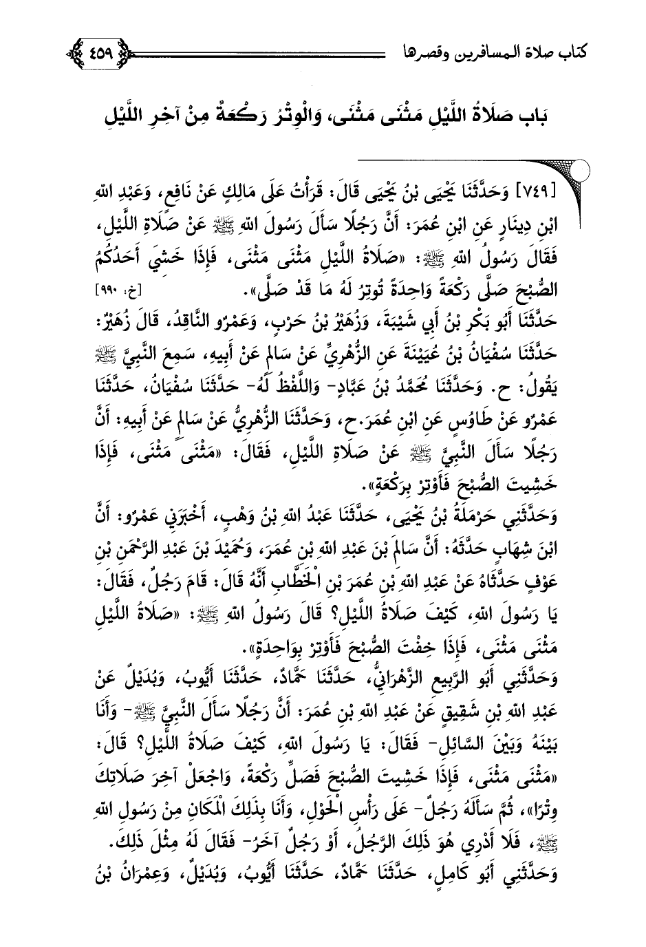 [٧٤٩] وَحَدَّثَنَا يَحْيَى بْنُ يَحْيَى قَالَ: قَرَأْتُ عَلَى مَالِكٍ عَنْ نَافِعٍ، وَعَبْدِ اللَّهِ ابْنِ دِينَارٍ عَنِ ابْنِ عُمَرَ: أَنَّ رَجُلًا سَأَلَ رَسُولَ اللَّهِ صلى الله عليه وسلم عَنْ صَلَاةِ اللَّيْلِ، فَقَالَ رَسُولُ اللَّهِ صلى الله عليه وسلم: ((صَلَاةُ اللَّيْلِ مَثْنَى مَثْنَى، فَإِذَا خَشِيَ أَحَدُكُمُ الصُّبْحَ صَلَّى رَكْعَةً وَاحِدَةً تُوتِرُ لَهُ مَا قَدْ صَلَّى)).
