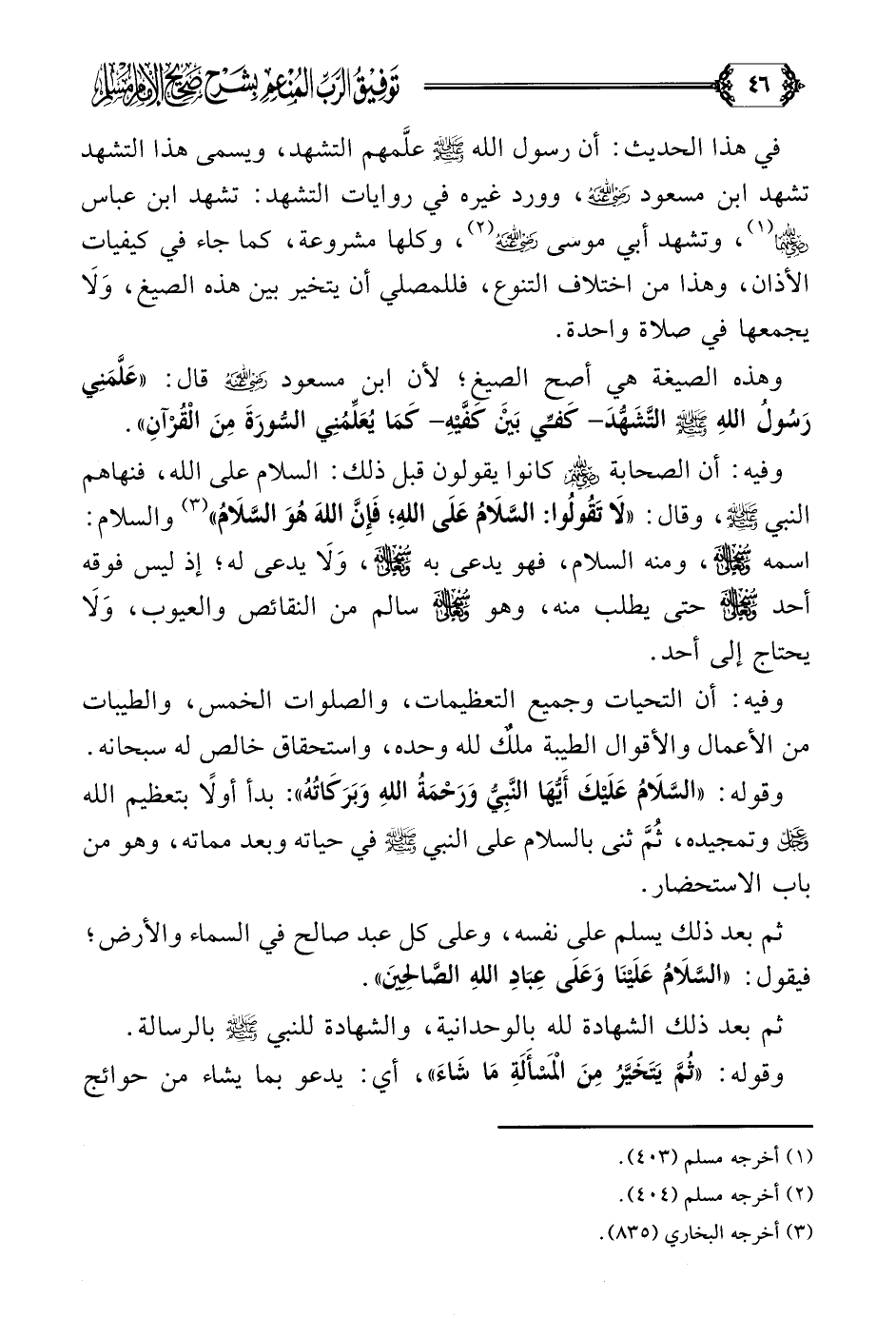 في هذا الحديث: أن رسول الله صلى الله عليه وسلم علَّمهم التشهد، ويسمى هذا التشهد تشهد ابن مسعود رضي الله عنه، وورد غيره في روايات التشهد: تشهد ابن عباس رضي الله عنهما (¬١)، وتشهد أبي موسى رضي الله عنه (¬٢)، وكلها مشروعة، كما جاء في كيفيات الأذان، وهذا من اختلاف التنوع، فللمصلي أن يتخير بين هذه الصيغ، وَلَا يجمعها في صلاة واحدة.