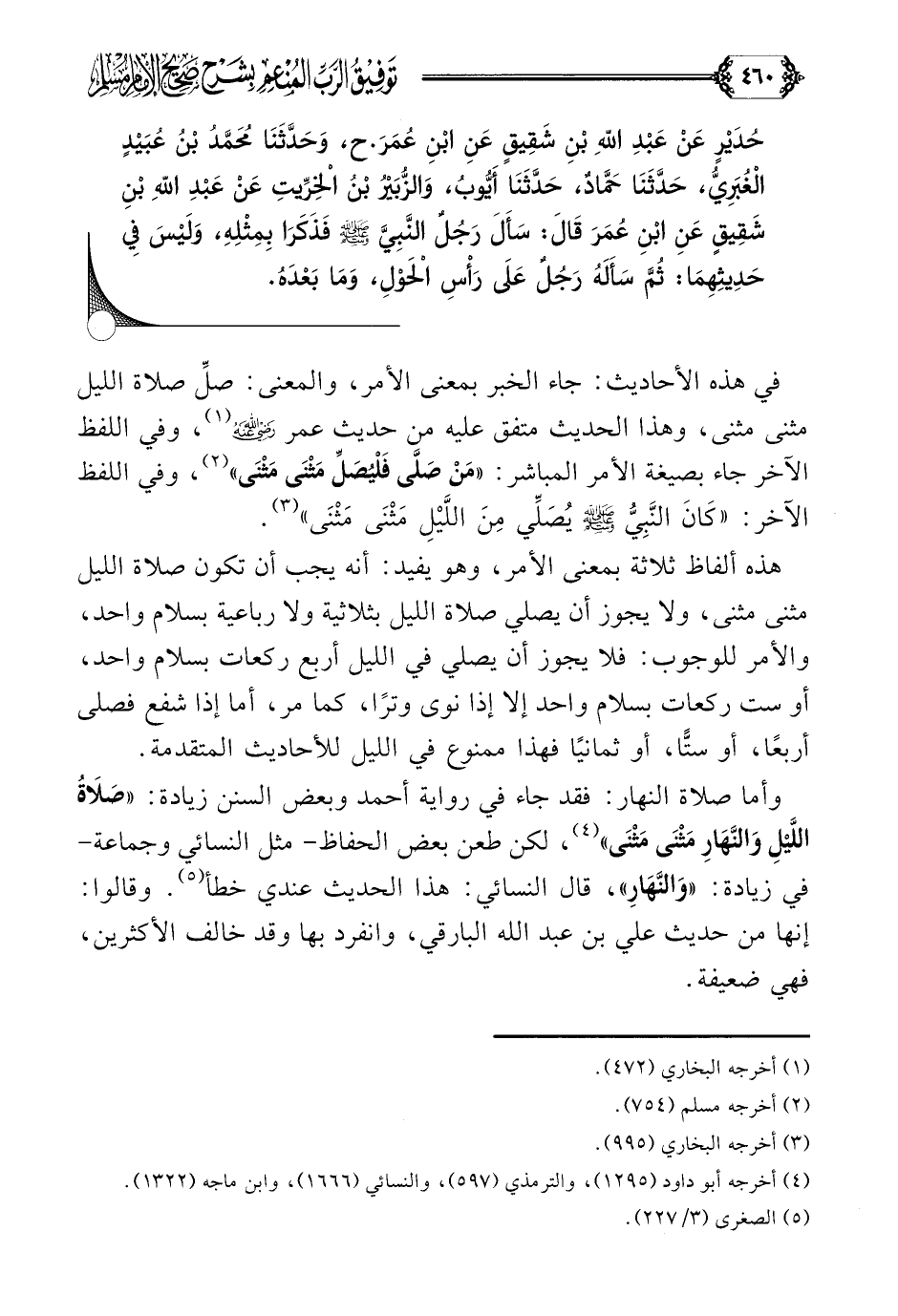 وأما صلاة النهار: فقد جاء في رواية أحمد وبعض السنن زيادة: ((صَلَاةُ اللَّيْلِ وَالنَّهَارِ مَثْنَى مَثْنَى)) (¬٤)، لكن طعن بعض الحفاظ- مثل النسائي وجماعة- في زيادة: ((وَالنَّهَارِ)) (¬٥)، قال النسائي: هذا الحديث عندي خطأ (¬٦). وقالوا: إنها من رواية عروة البارقي، وانفرد بها وقد خالف الأكثرين، فهي ضعيفة.
