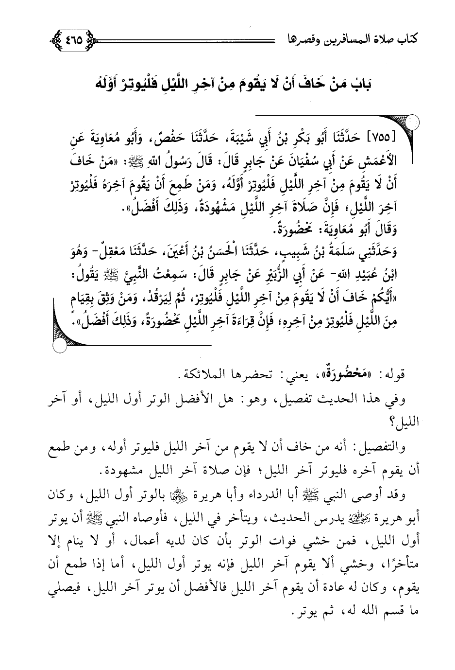 [٧٥٥] حَدَّثَنَا أَبُو بَكْرِ بْنُ أَبِي شَيْبَةَ، حَدَّثَنَا حَفْصٌ، وَأَبُو مُعَاوِيَةَ عَنِ الأَعْمَشِ عَنْ أَبِي سُفْيَانَ عَنْ جَابِرٍ قَالَ: قَالَ رَسُولُ اللَّهِ صلى الله عليه وسلم: ((مَنْ خَافَ أَنْ لَا يَقُومَ مِنْ آخِرِ اللَّيْلِ فَلْيُوتِرْ أَوَّلَهُ، وَمَنْ طَمِعَ أَنْ يَقُومَ آخِرَهُ فَلْيُوتِرْ آخِرَ اللَّيْلِ؛ فَإِنَّ صَلَاةَ آخِرِ اللَّيْلِ مَشْهُودَةٌ، وَذَلِكَ أَفْضَلُ)).