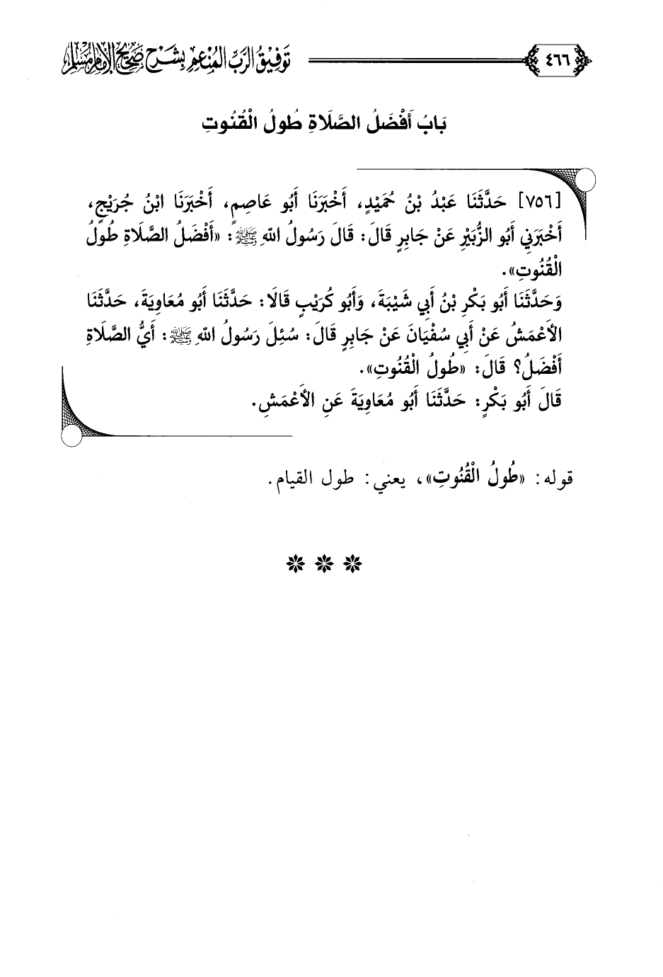 [٧٥٦] حَدَّثَنَا عَبْدُ بْنُ حُمَيْدٍ، أَخْبَرَنَا أَبُو عَاصِمٍ، أَخْبَرَنَا ابْنُ جُرَيْجٍ، أَخْبَرَنِي أَبُو الزُّبَيْرِ عَنْ جَابِرٍ قَالَ: قَالَ رَسُولُ اللَّهِ صلى الله عليه وسلم: ((أَفْضَلُ الصَّلَاةِ طُولُ الْقُنُوتِ)).