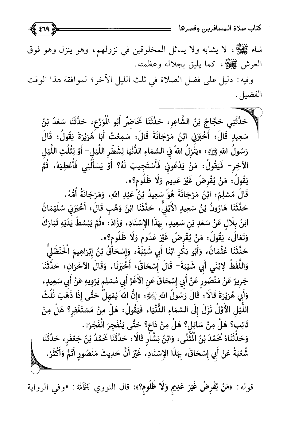 حَدَّثَنِي حَجَّاجُ بْنُ الشَّاعِرِ، حَدَّثَنَا مُحَاضِرٌ أَبُو الْمُوَرِّعِ، حَدَّثَنَا سَعْدُ بْنُ سَعِيدٍ قَالَ: أَخْبَرَنِي ابْنُ مَرْجَانَةَ قَالَ: سَمِعْتُ أَبَا هُرَيْرَةَ يَقُولُ: قَالَ رَسُولُ اللَّهِ صلى الله عليه وسلم: ((يَنْزِلُ اللَّهُ فِي السَّمَاءِ الدُّنْيَا لِشَطْرِ اللَّيْلِ- أَوْ لِثُلُثِ اللَّيْلِ الآخِرِ- فَيَقُولُ: مَنْ يَدْعُونِي فَأَسْتَجِيبَ لَهُ؟ أَوْ يَسْأَلُنِي فَأُعْطِيَهُ، ثُمَّ يَقُولُ: مَنْ يُقْرِضُ غَيْرَ عَدِيمٍ وَلَا ظَلُومٍ؟ )).