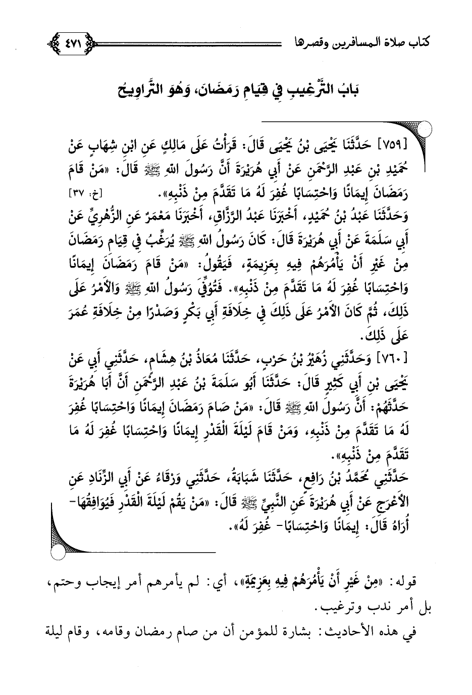 [٧٥٩] حَدَّثَنَا يَحْيَى بْنُ يَحْيَى قَالَ: قَرَأْتُ عَلَى مَالِكٍ عَنِ ابْنِ شِهَابٍ عَنْ حُمَيْدِ بْنِ عَبْدِ الرَّحْمَنِ عَنْ أَبِي هُرَيْرَةَ أَنَّ رَسُولَ اللَّهِ صلى الله عليه وسلم قَالَ: ((مَنْ قَامَ رَمَضَانَ إِيمَانًا وَاحْتِسَابًا غُفِرَ لَهُ مَا تَقَدَّمَ مِنْ ذَنْبِهِ)).