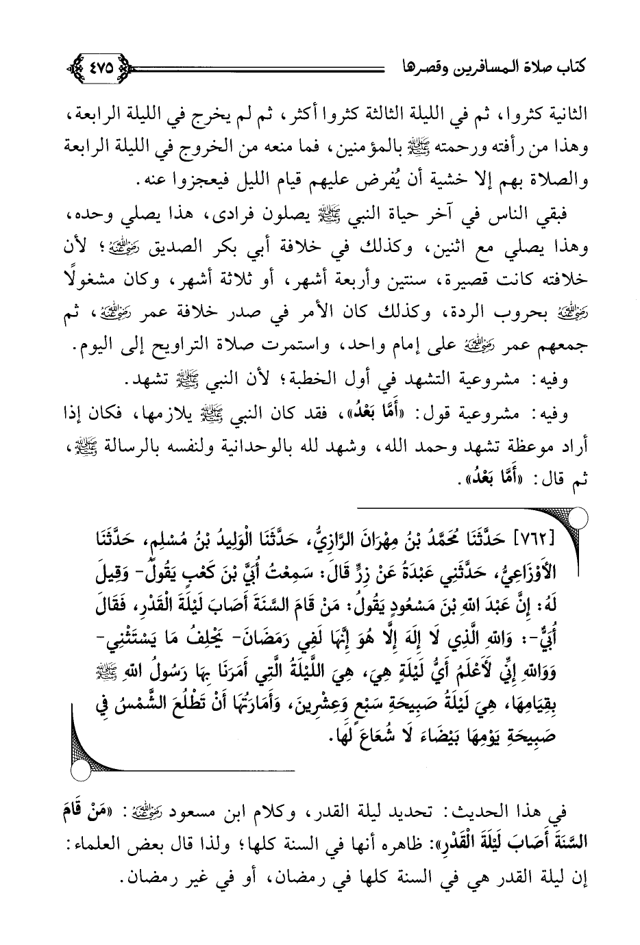 [٧٦٢] حَدَّثَنَا مُحَمَّدُ بْنُ مِهْرَانَ الرَّازِيُّ، حَدَّثَنَا الْوَلِيدُ بْنُ مُسْلِمٍ، حَدَّثَنَا الأَوْزَاعِيُّ، حَدَّثَنِي عَبْدَةُ عَنْ زِرٍّ قَالَ: سَمِعْتُ أُبَيَّ بْنَ كَعْبٍ يَقُولُ- وَقِيلَ لَهُ: إِنَّ عَبْدَ اللَّهِ بْنَ مَسْعُودٍ يَقُولُ: مَنْ قَامَ السَّنَةَ أَصَابَ لَيْلَةَ الْقَدْرِ، فَقَالَ أُبَيٌّ-: وَاللَّهِ الَّذِي لَا إِلَهَ إِلَّا هُوَ إِنَّهَا لَفِي رَمَضَانَ- يَحْلِفُ مَا يَسْتَثْنِي- وَوَاللَّهِ إِنِّي لَأَعْلَمُ أَيُّ لَيْلَةٍ هِيَ، هِيَ اللَّيْلَةُ الَّتِي أَمَرَنَا بِهَا رَسُولُ اللَّهِ صلى الله عليه وسلم بِقِيَامِهَا، هِيَ لَيْلَةُ صَبِيحَةِ سَبْعٍ وَعِشْرِينَ، وَأَمَارَتُهَا أَنْ تَطْلُعَ الشَّمْسُ فِي صَبِيحَةِ يَوْمِهَا بَيْضَاءَ لَا شُعَاعَ لَهَا.