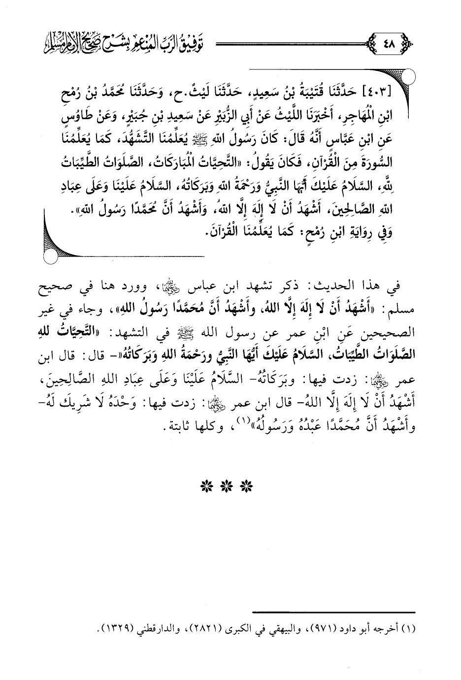 [٤٠٣] حَدَّثَنَا قُتَيْبَةُ بْنُ سَعِيدٍ، حَدَّثَنَا لَيْثٌ. ح، وَحَدَّثَنَا مُحَمَّدُ بْنُ رُمْحِ بْنِ الْمُهَاجِرِ، أَخْبَرَنَا اللَّيْثُ عَنْ أَبِي الزُّبَيْرِ عَنْ سَعِيدِ بْنِ جُبَيْرٍ، وَعَنْ طَاوُسٍ عَنِ ابْنِ عَبَّاسٍ أَنَّهُ قَالَ: كَانَ رَسُولُ اللَّهِ صلى الله عليه وسلم يُعَلِّمُنَا التَّشَهُّدَ، كَمَا يُعَلِّمُنَا السُّورَةَ مِنَ الْقُرْآنِ، فَكَانَ يَقُولُ: ((التَّحِيَّاتُ الْمُبَارَكَاتُ، الصَّلَوَاتُ الطَّيِّبَاتُ لِلَّهِ، السَّلَامُ عَلَيْكَ أَيُّهَا النَّبِيُّ وَرَحْمَةُ اللَّهِ وَبَرَكَاتُهُ، السَّلَامُ عَلَيْنَا وَعَلَى عِبَادِ اللَّهِ الصَّالِحِينَ، أَشْهَدُ أَنْ لَا إِلَهَ إِلَّا اللَّهُ، وَأَشْهَدُ أَنَّ مُحَمَّدًا رَسُولُ اللَّهِ)).