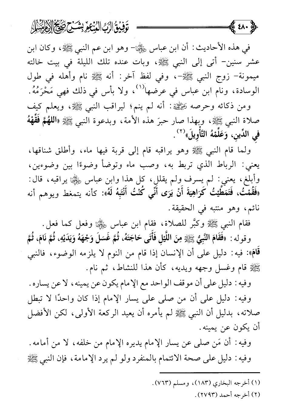في هذه الأحاديث: أن ابن عباس رضي الله عنهما- وهو ابن عم النبي صلى الله عليه وسلم، وكان ابن عشر سنين- أتى إلى النبي صلى الله عليه وسلم، وبات عنده تلك الليلة في بيت خالته ميمونة- زوج النبي صلى الله عليه وسلم-، وفي لفظ آخر: أنه صلى الله عليه وسلم نام وأهله في طول الوسادة، ونام ابن عباس في عرضها (¬١)، ولا بأس في ذلك فهي مَحْرَمُهُ.