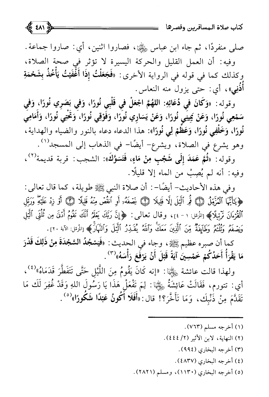وقوله: ((وَكَانَ فِي دُعَائِهِ: اللَّهُمَّ اجْعَلْ فِي قَلْبِي نُورًا، وَفِي بَصَرِي نُورًا، وَفِي سَمْعِي نُورًا، وَعَنْ يَمِينِي نُورًا، وَعَنْ يَسَارِي نُورًا، وَفَوْقِي نُورًا، وَتَحْتِي نُورًا، وَأَمَامِي نُورًا، وَخَلْفِي نُورًا، وَعَظِّمْ لِي نُورًا)): هذا الدعاء دعاء بالنور والضياء والهداية، وهو يشرع في الصلاة، ويشرع- أيضًا- في الذهاب إلى المسجد (¬١).