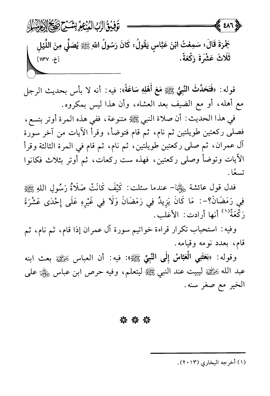 قوله: ((فَتَحَدَّثَ النَّبِيُّ صلى الله عليه وسلم مَعَ أَهْلِهِ سَاعَةً)): فيه: أنه لا بأس بحديث الرجل مع أهله، أو مع الضيف بعد العشاء، وأن هذا ليس بمكروه.