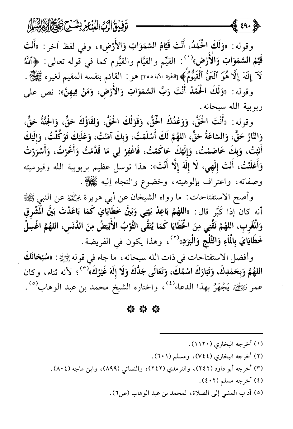 وأصح الاستفتاحات: ما رواه الشيخان عن أبي هريرة رضي الله عنه عن النبي صلى الله عليه وسلم أنه كان إذا كَبَّر قال: ((اللَّهُمَّ بَاعِدْ بَيْنِي وَبَيْنَ خَطَايَايَ كَمَا بَاعَدْتَ بَيْنَ الْمَشْرِقِ وَالْمَغْرِبِ، اللَّهُمَّ نَقِّنِي مِنَ الْخَطَايَا كَمَا يُنَقَّى الثَّوْبُ الْأَبْيَضُ مِنَ الدَّنَسِ، اللَّهُمَّ اغْسِلْ خَطَايَايَ بِالْمَاءِ وَالثَّلْجِ وَالْبَرَدِ)) (¬٢)، وهذا يكون في الفريضة.