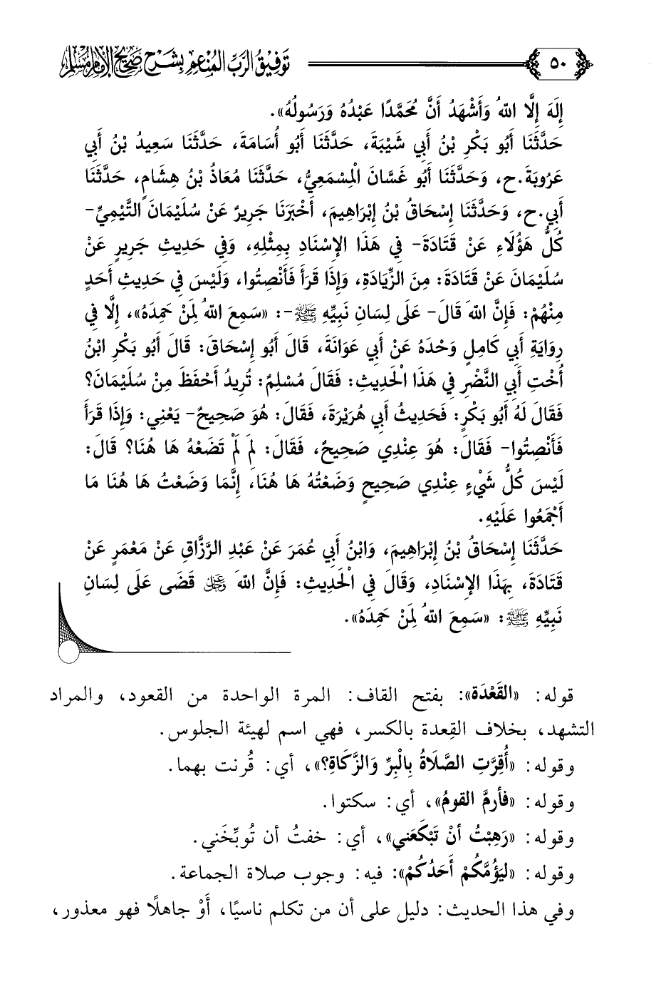 حَدَّثَنَا أَبُو بَكْرِ بْنُ أَبِي شَيْبَةَ، حَدَّثَنَا أَبُو أُسَامَةَ، حَدَّثَنَا سَعِيدُ بْنُ أَبِي عَرُوبَةَ. ح، وَحَدَّثَنَا أَبُو غَسَّانَ الْمِسْمَعِيُّ، حَدَّثَنَا مُعَاذُ بْنُ هِشَامٍ، حَدَّثَنَا أَبِي. ح، وَحَدَّثَنَا إِسْحَاقُ بْنُ إِبْرَاهِيمَ، أَخْبَرَنَا جَرِيرٌ عَنْ سُلَيْمَانَ التَّيْمِيِّ- كُلُّ هَؤُلَاءِ عَنْ قَتَادَةَ- فِي هَذَا الإِسْنَادِ بِمِثْلِهِ، وَفِي حَدِيثِ جَرِيرٍ عَنْ سُلَيْمَانَ عَنْ قَتَادَةَ: مِنَ الزِّيَادَةِ، وَإِذَا قَرَأَ فَأَنْصِتُوا، وَلَيْسَ فِي حَدِيثِ أَحَدٍ مِنْهُمْ: فَإِنَّ اللَّهَ قَالَ- عَلَى لِسَانِ نَبِيِّهِ صلى الله عليه وسلم-: ((سَمِعَ اللَّهُ لِمَنْ حَمِدَهُ))، إِلَّا فِي رِوَايَةِ أَبِي كَامِلٍ وَحْدَهُ عَنْ أَبِي عَوَانَةَ، قَالَ أَبُو إِسْحَاقَ: قَالَ أَبُو بَكْرِ ابْنُ أُخْتِ أَبِي النَّضْرِ فِي هَذَا الْحَدِيثِ: فَقَالَ مُسْلِمٌ: تُرِيدُ أَحْفَظَ مِنْ سُلَيْمَانَ؟ فَقَالَ لَهُ أَبُو بَكْرٍ: فَحَدِيثُ أَبِي هُرَيْرَةَ، فَقَالَ: هُوَ صَحِيحٌ- يَعْنِي: وَإِذَا قَرَأَ فَأَنْصِتُوا- فَقَالَ: هُوَ عِنْدِي صَحِيحٌ، فَقَالَ: لِمَ لَمْ تَضَعْهُ هَا هُنَا؟ قَالَ: لَيْسَ كُلُّ شَيْءٍ عِنْدِي صَحِيحٍ وَضَعْتُهُ هَا هُنَا، إِنَّمَا وَضَعْتُ هَا هُنَا مَا أَجْمَعُوا عَلَيْهِ.
