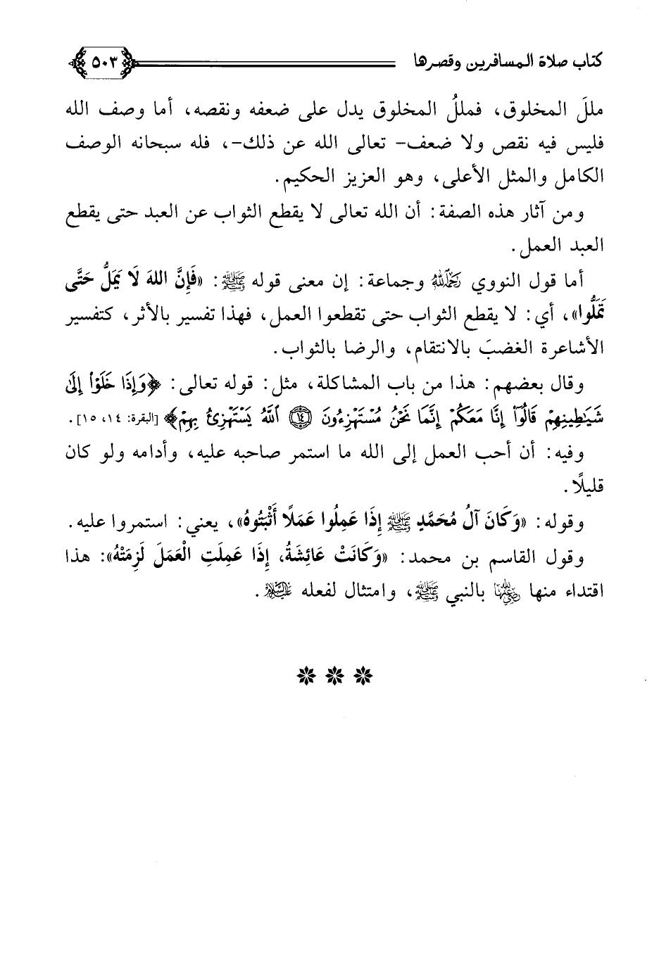 أما قول النووي رحمه الله وجماعة: إن معنى قوله صلى الله عليه وسلم: ((فَإِنَّ اللَّهَ لَا يَمَلُّ حَتَّى تَمَلُّوا))، أي: لا يقطع الثواب حتى تقطعوا العمل، فهذا تفسير بالأثر، كتفسير الأشاعرة الغضبَ بالانتقام، والرضا بالثواب.