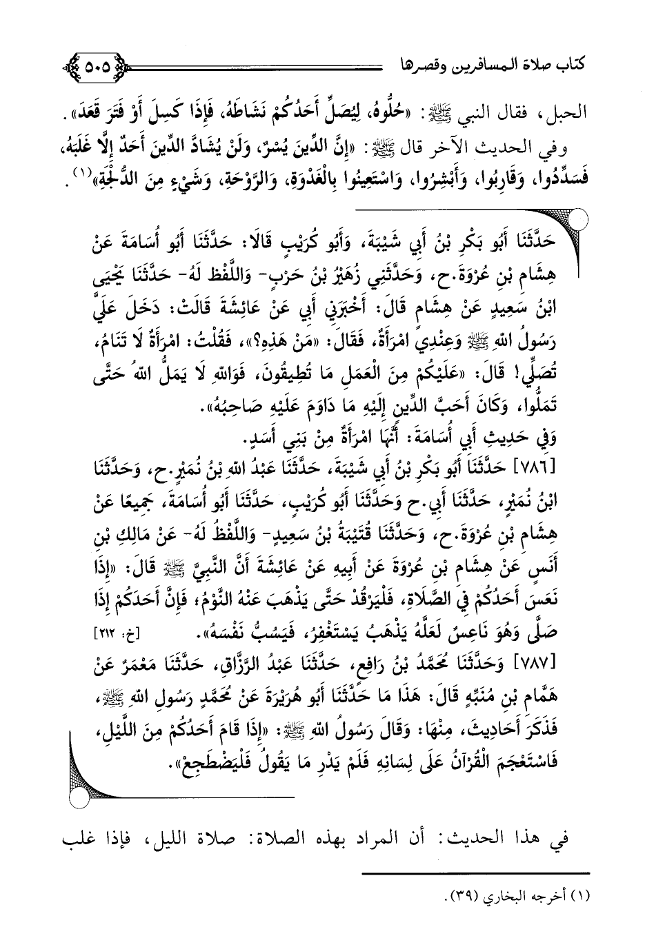 [٧٨٦] حَدَّثَنَا أَبُو بَكْرِ بْنُ أَبِي شَيْبَةَ، حَدَّثَنَا عَبْدُ اللَّهِ بْنُ نُمَيْرٍ. ح، وَحَدَّثَنَا ابْنُ نُمَيْرٍ، حَدَّثَنَا أَبِي. ح وَحَدَّثَنَا أَبُو كُرَيْبٍ، حَدَّثَنَا أَبُو أُسَامَةَ، جَمِيعًا عَنْ هِشَامِ بْنِ عُرْوَةَ. ح، وَحَدَّثَنَا قُتَيْبَةُ بْنُ سَعِيدٍ- وَاللَّفْظُ لَهُ- عَنْ مَالِكِ بْنِ أَنَسٍ عَنْ هِشَامِ بْنِ عُرْوَةَ عَنْ أَبِيهِ عَنْ عَائِشَةَ أَنَّ النَّبِيَّ صلى الله عليه وسلم قَالَ: ((إِذَا نَعَسَ أَحَدُكُمْ فِي الصَّلَاةِ، فَلْيَرْقُدْ حَتَّى يَذْهَبَ عَنْهُ النَّوْمُ؛ فَإِنَّ أَحَدَكُمْ إِذَا صَلَّى وَهُوَ نَاعِسٌ لَعَلَّهُ يَذْهَبُ يَسْتَغْفِرُ، فَيَسُبُّ نَفْسَهُ)).