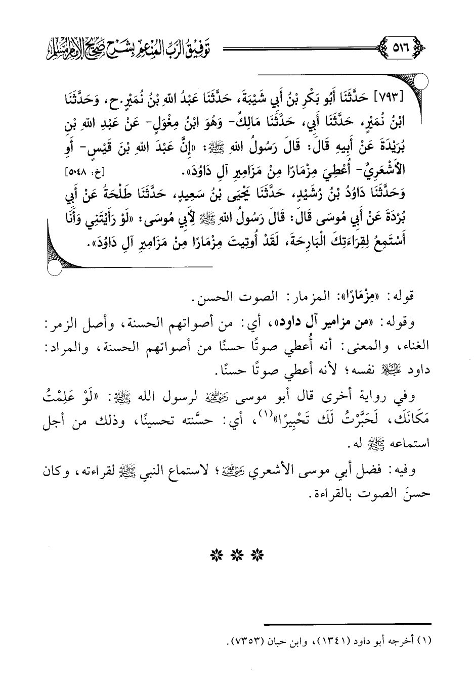 [٧٩٣] حَدَّثَنَا أَبُو بَكْرِ بْنُ أَبِي شَيْبَةَ، حَدَّثَنَا عَبْدُ اللَّهِ بْنُ نُمَيْرٍ. ح، وَحَدَّثَنَا ابْنُ نُمَيْرٍ، حَدَّثَنَا أَبِي، حَدَّثَنَا مَالِكٌ- وَهُوَ ابْنُ مِغْوَلٍ- عَنْ عَبْدِ اللَّهِ بْنِ بُرَيْدَةَ عَنْ أَبِيهِ قَالَ: قَالَ رَسُولُ اللَّهِ صلى الله عليه وسلم: ((إِنَّ عَبْدَ اللَّهِ بْنَ قَيْسٍ- أَوِ الأَشْعَرِيَّ- أُعْطِيَ مِزْمَارًا مِنْ مَزَامِيرِ آلِ دَاوُدَ)).