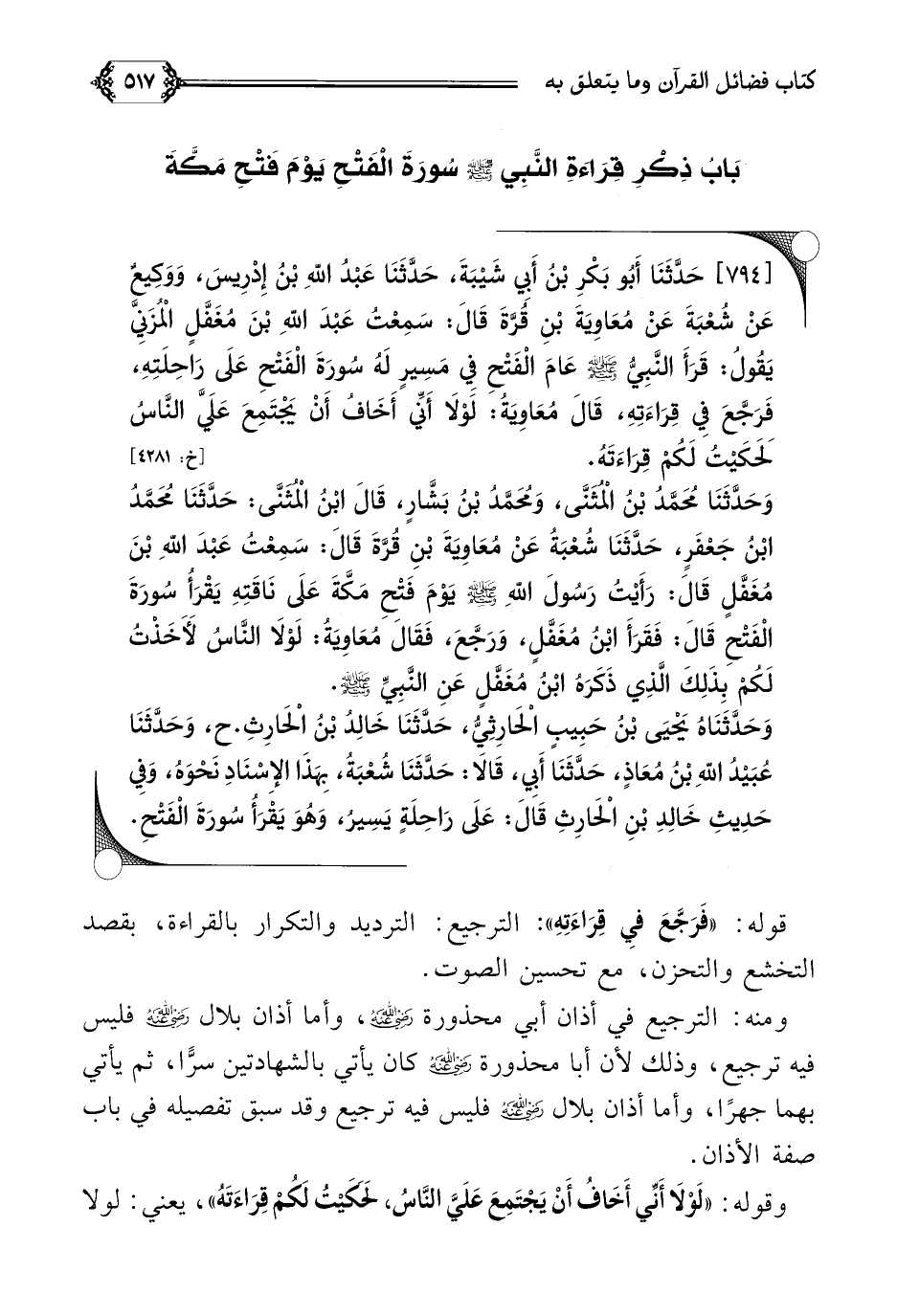 [٧٩٤] حَدَّثَنَا أَبُو بَكْرِ بْنُ أَبِي شَيْبَةَ، حَدَّثَنَا عَبْدُ اللَّهِ بْنُ إِدْرِيسَ، وَوَكِيعٌ عَنْ شُعْبَةَ عَنْ مُعَاوِيَةَ بْنِ قُرَّةَ قَالَ: سَمِعْتُ عَبْدَ اللَّهِ بْنَ مُغَفَّلٍ الْمُزَنِيَّ يَقُولُ: قَرَأَ النَّبِيُّ صلى الله عليه وسلم عَامَ الْفَتْحِ فِي مَسِيرٍ لَهُ سُورَةَ الْفَتْحِ عَلَى رَاحِلَتِهِ، فَرَجَّعَ فِي قِرَاءَتِهِ، قَالَ مُعَاوِيَةُ: لَوْلَا أَنِّي أَخَافُ أَنْ يَجْتَمِعَ عَلَيَّ النَّاسُ لَحَكَيْتُ لَكُمْ قِرَاءَتَهُ.