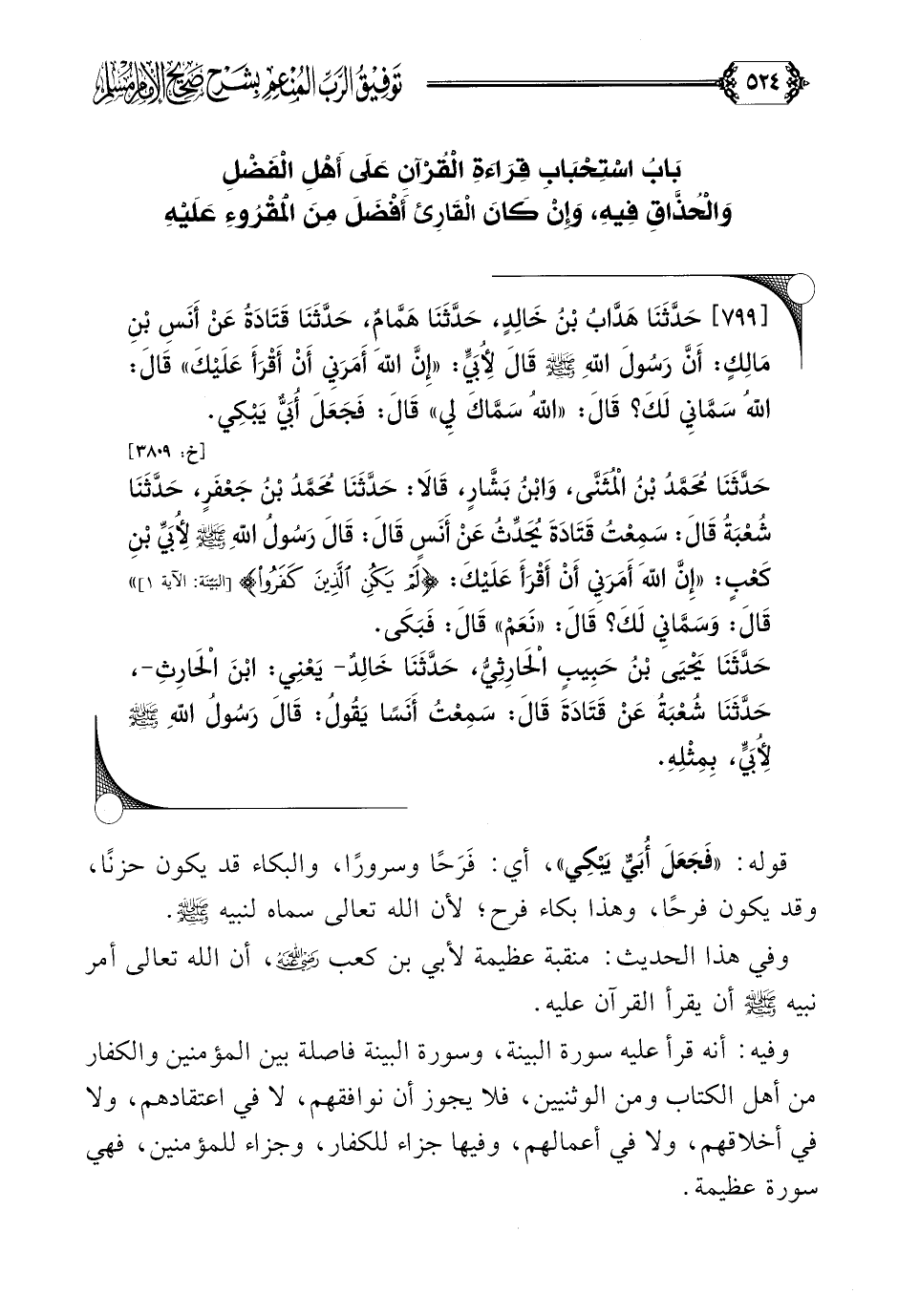 حَدَّثَنَا مُحَمَّدُ بْنُ الْمُثَنَّى، وَابْنُ بَشَّارٍ، قَالَا: حَدَّثَنَا مُحَمَّدُ بْنُ جَعْفَرٍ، حَدَّثَنَا شُعْبَةُ قَالَ: سَمِعْتُ قَتَادَةَ يُحَدِّثُ عَنْ أَنَسٍ قَالَ: قَالَ رَسُولُ اللَّهِ صلى الله عليه وسلم لِأُبَيِّ بْنِ كَعْبٍ: ((إِنَّ اللَّهَ أَمَرَنِي أَنْ أَقْرَأَ عَلَيْكَ: {لَمْ يَكُنِ الَّذِينَ كَفَرُوا})) قَالَ: وَسَمَّانِي لَكَ؟ قَالَ: ((نَعَمْ)) قَالَ: فَبَكَى.