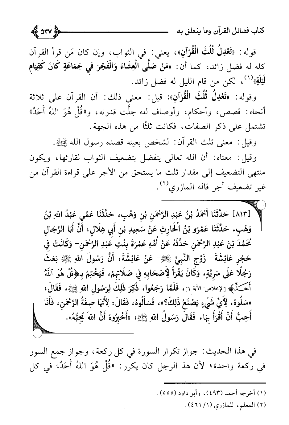 [٨١٣] حَدَّثَنَا أَحْمَدُ بْنُ عَبْدِ الرَّحْمَنِ بْنِ وَهْبٍ، حَدَّثَنَا عَمِّي عَبْدُ اللَّهِ بْنُ وَهْبٍ، حَدَّثَنَا عَمْرُو بْنُ الْحَارِثِ عَنْ سَعِيدِ بْنِ أَبِي هِلَالٍ: أَنَّ أَبَا الرِّجَالِ مُحَمَّدَ بْنَ عَبْدِ الرَّحْمَنِ حَدَّثَهُ عَنْ أُمِّهِ عَمْرَةَ بِنْتِ عَبْدِ الرَّحْمَنِ- وَكَانَتْ فِي حَجْرِ عَائِشَةَ- زَوْجِ النَّبِيِّ صلى الله عليه وسلم- عَنْ عَائِشَةَ: أَنَّ رَسُولَ اللَّهِ صلى الله عليه وسلم بَعَثَ رَجُلًا عَلَى سَرِيَّةٍ، وَكَانَ يَقْرَأُ لِأَصْحَابِهِ فِي صَلَاتِهِمْ، فَيَخْتِمُ بِـ {قُلْ هُوَ اللَّهُ أَحَدٌ}، فَلَمَّا رَجَعُوا، ذُكِرَ ذَلِكَ لِرَسُولِ اللَّهِ صلى الله عليه وسلم، فَقَالَ: ((سَلُوهُ، لِأَيِّ شَيْءٍ يَصْنَعُ ذَلِكَ؟ ))، فَسَأَلُوهُ، فَقَالَ: لِأَنَّهَا صِفَةُ الرَّحْمَنِ، فَأَنَا أُحِبُّ أَنْ أَقْرَأَ بِهَا، فَقَالَ رَسُولُ اللَّهِ صلى الله عليه وسلم: ((أَخْبِرُوهُ أَنَّ اللَّهَ يُحِبُّهُ)).