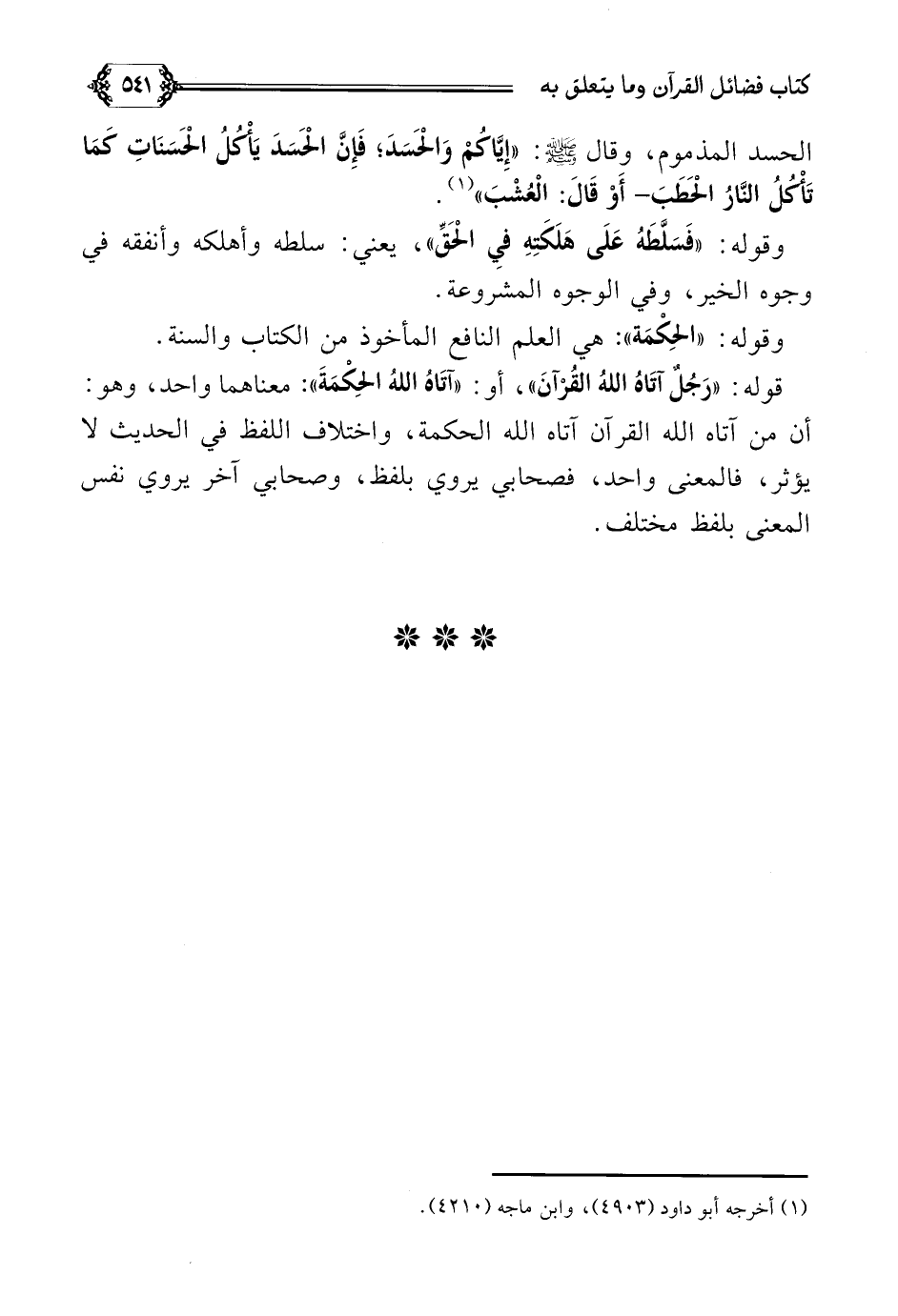 الحسد المذموم، وقال صلى الله عليه وسلم: ((إِيَّاكُمْ وَالْحَسَدَ؛ فَإِنَّ الْحَسَدَ يَأْكُلُ الْحَسَنَاتِ كَمَا تَأْكُلُ النَّارُ الْحَطَبَ- أَوْ قَالَ: الْعُشْبَ)) (¬١).