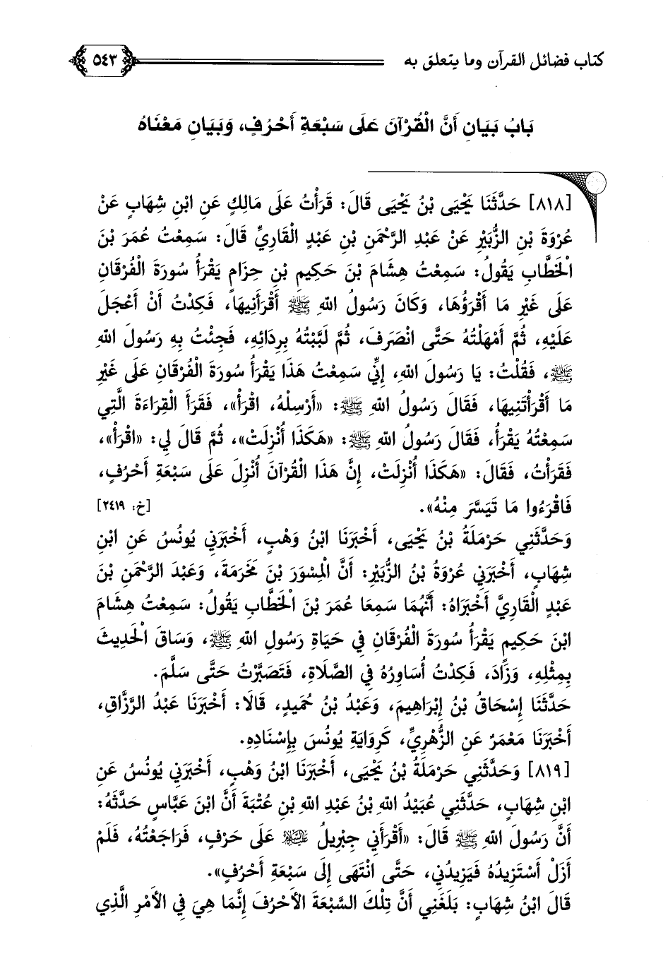 [٨١٨] حَدَّثَنَا يَحْيَى بْنُ يَحْيَى قَالَ: قَرَأْتُ عَلَى مَالِكٍ عَنِ ابْنِ شِهَابٍ عَنْ عُرْوَةَ بْنِ الزُّبَيْرِ عَنْ عَبْدِ الرَّحْمَنِ بْنِ عَبْدٍ الْقَارِيِّ قَالَ: سَمِعْتُ عُمَرَ بْنَ الْخَطَّابِ يَقُولُ: سَمِعْتُ هِشَامَ بْنَ حَكِيمِ بْنِ حِزَامٍ يَقْرَأُ سُورَةَ الْفُرْقَانِ عَلَى غَيْرِ مَا أَقْرَؤُهَا، وَكَانَ رَسُولُ اللَّهِ صلى الله عليه وسلم أَقْرَأَنِيهَا، فَكِدْتُ أَنْ أَعْجَلَ عَلَيْهِ، ثُمَّ أَمْهَلْتُهُ حَتَّى انْصَرَفَ، ثُمَّ لَبَّبْتُهُ بِرِدَائِهِ، فَجِئْتُ بِهِ رَسُولَ اللَّهِ صلى الله عليه وسلم، فَقُلْتُ: يَا رَسُولَ اللَّهِ، إِنِّي سَمِعْتُ هَذَا يَقْرَأُ سُورَةَ الْفُرْقَانِ عَلَى غَيْرِ مَا أَقْرَأْتَنِيهَا، فَقَالَ رَسُولُ اللَّهِ صلى الله عليه وسلم: ((أَرْسِلْهُ، اقْرَأْ))، فَقَرَأَ الْقِرَاءَةَ الَّتِي سَمِعْتُهُ يَقْرَأُ، فَقَالَ رَسُولُ اللَّهِ صلى الله عليه وسلم: ((هَكَذَا أُنْزِلَتْ))، ثُمَّ قَالَ لِي: ((اقْرَأْ))، فَقَرَأْتُ، فَقَالَ: ((هَكَذَا أُنْزِلَتْ، إِنَّ هَذَا الْقُرْآنَ أُنْزِلَ عَلَى سَبْعَةِ أَحْرُفٍ، فَاقْرَءُوا مَا تَيَسَّرَ مِنْهُ)).