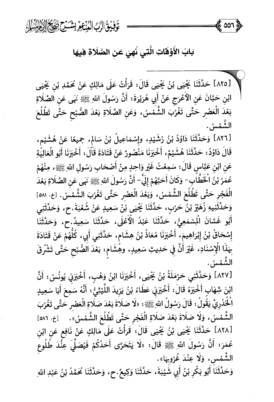 [٨٢٥] حَدَّثَنَا يَحْيَى بْنُ يَحْيَى قَالَ: قَرَأْتُ عَلَى مَالِكٍ عَنْ مُحَمَّدِ بْنِ يَحْيَى ابْنِ حَبَّانَ عَنِ الأَعْرَجِ عَنْ أَبِي هُرَيْرَةَ: أَنَّ رَسُولَ اللَّهِ صلى الله عليه وسلم نَهَى عَنِ الصَّلَاةِ بَعْدَ الْعَصْرِ حَتَّى تَغْرُبَ الشَّمْسُ، وَعَنِ الصَّلَاةِ بَعْدَ الصُّبْحِ حَتَّى تَطْلُعَ الشَّمْسُ.