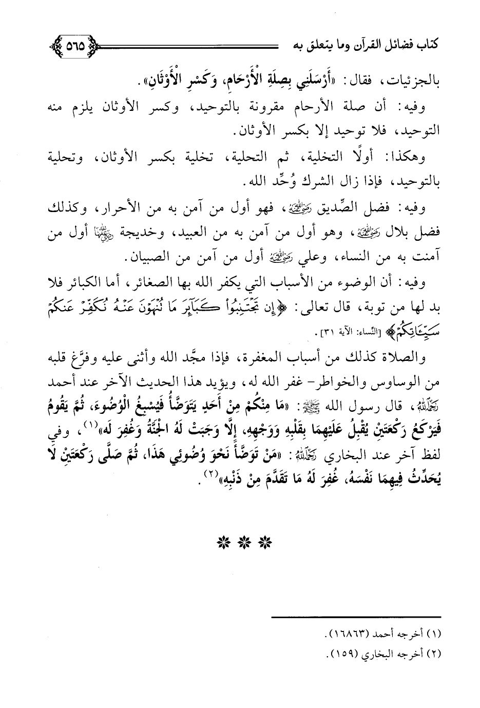 والصلاة كذلك من أسباب المغفرة، فإذا مجَّد الله وأثنى عليه وفرَّغ قلبه من الوساوس والخواطر- غفر الله له، ويؤيد هذا الحديث الآخر عند أحمد رحمه الله، قال رسول الله صلى الله عليه وسلم: ((مَا مِنْكُمْ مِنْ أَحَدٍ يَتَوَضَّأُ فَيُسْبِغُ الْوُضُوءَ، ثُمَّ يَقُومُ فَيَرْكَعُ رَكْعَتَيْنِ يُقْبِلُ عَلَيْهِمَا بِقَلْبِهِ وَوَجْهِهِ، إِلَّا وَجَبَتْ لَهُ الْجَنَّةُ وَغُفِرَ لَه)) (¬١)، وفي لفظ آخر عند البخاري رحمه الله: ((مَنْ تَوَضَّأَ نَحْوَ وُضُوئِي هَذَا، ثُمَّ صَلَّى رَكْعَتَيْنِ لَا يُحَدِّثُ فِيهِمَا نَفْسَهُ، غُفِرَ لَهُ مَا تَقَدَّمَ مِنْ ذَنْبِهِ)) (¬٢).