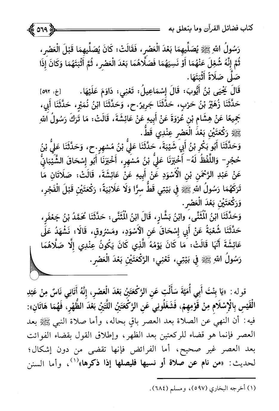 قوله: ((يَا بِنْتَ أَبِي أُمَيَّةَ سَأَلْتِ عَنِ الرَّكْعَتَيْنِ بَعْدَ الْعَصْرِ، إِنَّهُ أَتَانِي نَاسٌ مِنْ عَبْدِ الْقَيْسِ بِالْإِسْلَامِ مِنْ قَوْمِهِمْ، فَشَغَلُونِي عَنِ الرَّكْعَتَيْنِ اللَّتَيْنِ بَعْدَ الظُّهْرِ، فَهُمَا هَاتَانِ)): فيه: أن النهي عن الصلاة بعد العصر باقٍ بحاله، وأما صلاة النبي صلى الله عليه وسلم بعد العصر فإنما هو قضاء للركعتين بعد الظهر، وإطلاق القول بقضاء الفوائت بعد العصر غير صحيح، أما الفرائض فإنها تقضى من دون إشكال؛ لحديث: من نام عن صلاة أو نسيها فليصلها إذا ذكرها (¬١)، وأما السنن