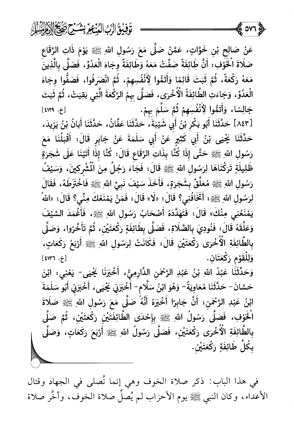 [٨٤٣] حَدَّثَنَا أَبُو بَكْرِ بْنُ أَبِي شَيْبَةَ، حَدَّثَنَا عَفَّانُ، حَدَّثَنَا أَبَانُ بْنُ يَزِيدَ، حَدَّثَنَا يَحْيَى بْنُ أَبِي كَثِيرٍ عَنْ أَبِي سَلَمَةَ عَنْ جَابِرٍ قَالَ: أَقْبَلْنَا مَعَ رَسُولِ اللَّهِ صلى الله عليه وسلم حَتَّى إِذَا كُنَّا بِذَاتِ الرِّقَاعِ قَالَ: كُنَّا إِذَا أَتَيْنَا عَلَى شَجَرَةٍ ظَلِيلَةٍ تَرَكْنَاهَا لِرَسُولِ اللَّهِ صلى الله عليه وسلم قَالَ: فَجَاءَ رَجُلٌ مِنَ الْمُشْرِكِينَ، وَسَيْفُ رَسُولِ اللَّهِ صلى الله عليه وسلم مُعَلَّقٌ بِشَجَرَةٍ، فَأَخَذَ سَيْفَ نَبِيِّ اللَّهِ صلى الله عليه وسلم فَاخْتَرَطَهُ، فَقَالَ لِرَسُولِ اللَّهِ صلى الله عليه وسلم: أَتَخَافُنِي؟ قَالَ: ((لَا)) قَالَ: فَمَنْ يَمْنَعُكَ مِنِّي؟ قَالَ: ((اللَّهُ يَمْنَعُنِي مِنْكَ)) قَالَ: فَتَهَدَّدَهُ أَصْحَابُ رَسُولِ اللَّهِ صلى الله عليه وسلم، فَأَغْمَدَ السَّيْفَ وَعَلَّقَهُ قَالَ: فَنُودِيَ بِالصَّلَاةِ، فَصَلَّى بِطَائِفَةٍ رَكْعَتَيْنِ، ثُمَّ تَأَخَّرُوا، وَصَلَّى بِالطَّائِفَةِ الْأُخْرَى رَكْعَتَيْنِ قَالَ: فَكَانَتْ لِرَسُولِ اللَّهِ صلى الله عليه وسلم أَرْبَعُ رَكَعَاتٍ، وَلِلْقَوْمِ رَكْعَتَانِ.