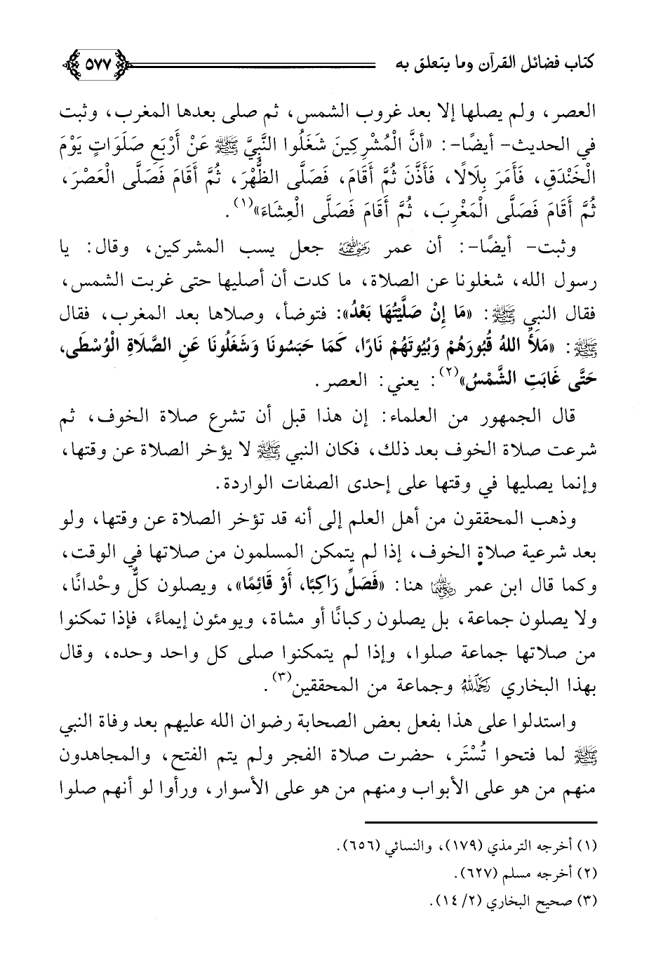 وذهب المحققون من أهل العلم إلى أنه قد تؤخر الصلاة عن وقتها، ولو بعد شرعية صلاة الخوف، إذا لم يتمكن المسلمون من صلاتها في الوقت، وكما قال ابن عمر رضي الله عنهما هنا: ((فَصَلِّ رَاكِبًا، أَوْ قَائِمًا))، ويصلون كلٌّ وحْدانًا، ولا يصلون جماعة، بل يصلون ركبانًا أو مشاة، ويومئون إيماءً، فإذا تمكنوا من صلاتها جماعة صلوا، وإذا لم يتمكنوا صلى كل واحد وحده، وقال بهذا البخاري رحمه الله وجماعة من المحققين (¬٣).