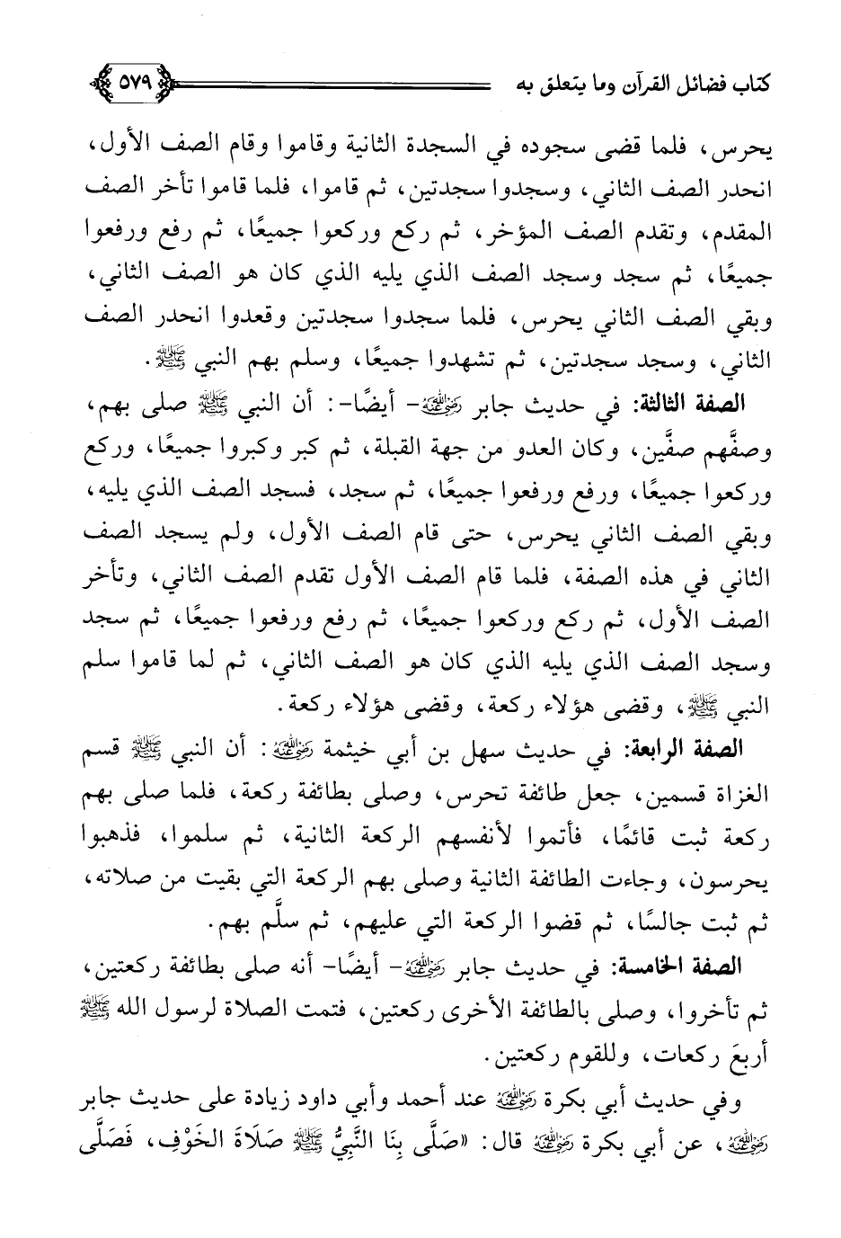 الصفة الثالثة: في حديث جابر رضي الله عنه- أيضًا-: أن النبي صلى الله عليه وسلم صلى بهم، وصفَّهم صفَّين، وكان العدو من جهة القبلة، ثم كبر وكبروا جميعًا، وركع وركعوا جميعًا، ورفع ورفعوا جميعًا، ثم سجد، فسجد الصف الذي يليه، وبقي الصف الثاني يحرس، حتى قام الصف الأول، ولم يسجد الصف الثاني في هذه الصفة، فلما قام الصف الأول تقدم الصف الثاني، وتأخر الصف الأول، ثم ركع وركعوا جميعًا، ثم رفع ورفعوا جميعًا، ثم سجد وسجد الصف الذي يليه الذي كان هو الصف الثاني، ثم لما قاموا سلم النبي صلى الله عليه وسلم، وقضى هؤلاء ركعة، وقضى هؤلاء ركعة.