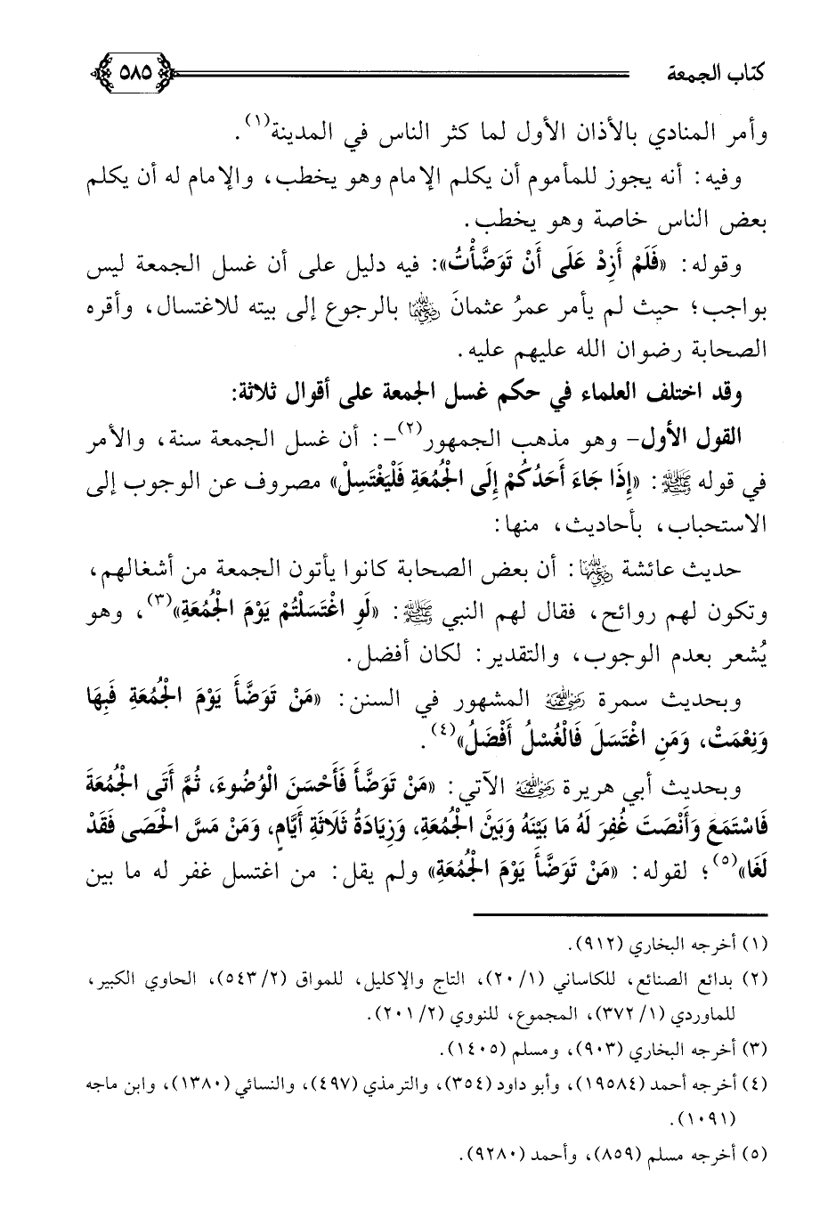 القول الأول: وهو مذهب الجمهور (¬٢): أن غسل الجمعة سنة، والأمر في قوله صلى الله عليه وسلم: ((إِذَا جَاءَ أَحَدُكُمْ إِلَى الْجُمُعَةِ فَلْيَغْتَسِلْ)) مصروف عن الوجوب إلى الاستحباب، بأحاديث، منها: