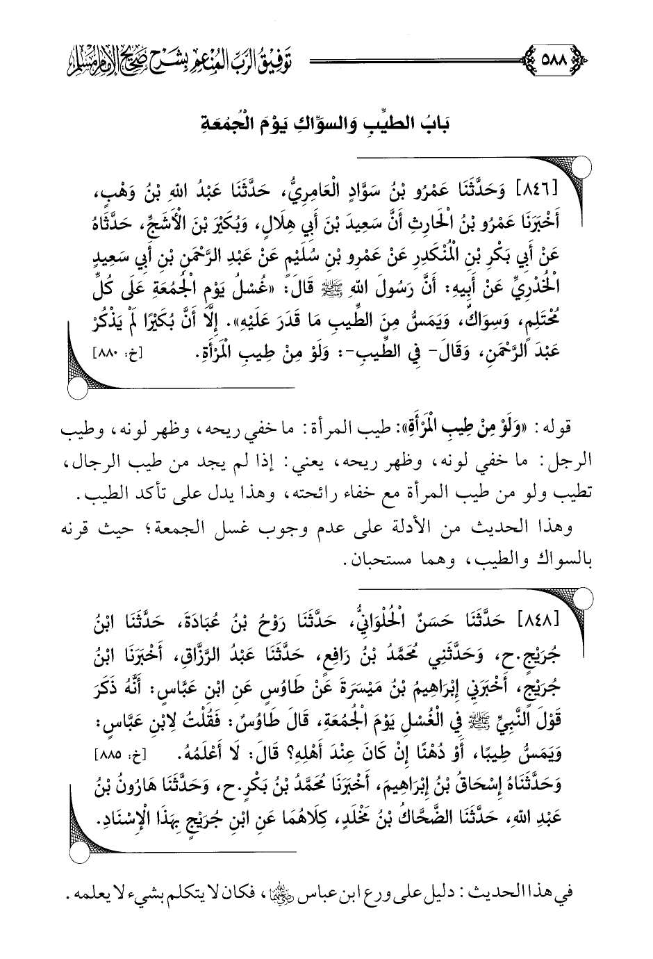 [٨٤٨] حَدَّثَنَا حَسَنٌ الْحُلْوَانِيُّ، حَدَّثَنَا رَوْحُ بْنُ عُبَادَةَ، حَدَّثَنَا ابْنُ جُرَيْجٍ. ح، وَحَدَّثَنِي مُحَمَّدُ بْنُ رَافِعٍ، حَدَّثَنَا عَبْدُ الرَّزَّاقِ، أَخْبَرَنَا ابْنُ جُرَيْجٍ، أَخْبَرَنِي إِبْرَاهِيمُ بْنُ مَيْسَرَةَ عَنْ طَاوُسٍ عَنِ ابْنِ عَبَّاسٍ: أَنَّهُ ذَكَرَ قَوْلَ النَّبِيِّ صلى الله عليه وسلم فِي الْغُسْلِ يَوْمَ الْجُمُعَةِ، قَالَ طَاوُسٌ: فَقُلْتُ لِابْنِ عَبَّاسٍ: وَيَمَسُّ طِيبًا، أَوْ دُهْنًا إِنْ كَانَ عِنْدَ أَهْلِهِ؟ قَالَ: لَا أَعْلَمُهُ.