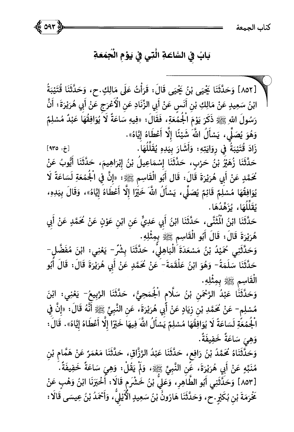 [٨٥٢] وَحَدَّثَنَا يَحْيَى بْنُ يَحْيَى قَالَ: قَرَأْتُ عَلَى مَالِكٍ. ح، وَحَدَّثَنَا قُتَيْبَةُ ابْنُ سَعِيدٍ عَنْ مَالِكِ بْنِ أَنَسٍ عَنْ أَبِي الزِّنَادِ عَنِ الْأَعْرَجِ عَنْ أَبِي هُرَيْرَةَ: أَنَّ رَسُولَ اللهِ صلى الله عليه وسلم ذَكَرَ يَوْمَ الْجُمُعَةِ، فَقَالَ: ((فِيهِ سَاعَةٌ لَا يُوَافِقُهَا عَبْدٌ مُسْلِمٌ وَهُوَ يُصَلِّي، يَسْأَلُ اللَّهَ شَيْئًا إِلَّا أَعْطَاهُ إِيَّاهُ)).