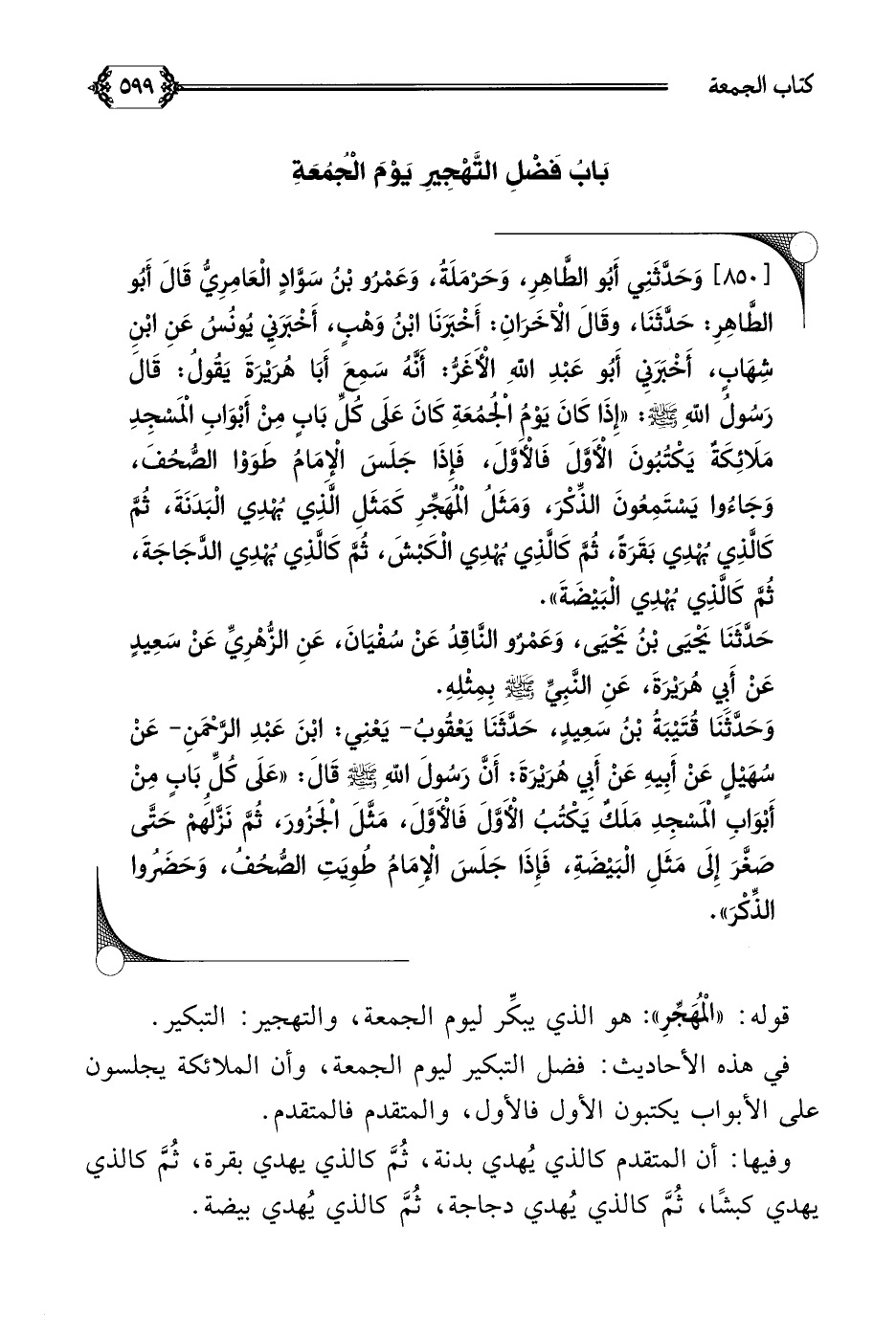 وفيها: أن المتقدم كالذي يُهدي بدنة، ثُمَّ كالذي يهدي بقرة، ثُمَّ كالذي يهدي كبشًا، ثُمَّ كالذي يُهدي دجاجة، ثُمَّ كالذي يُهدي بيضة.